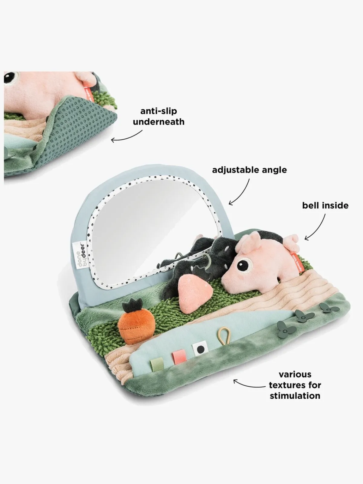 – Sjove farver og et spejl til visuel stimulering.
