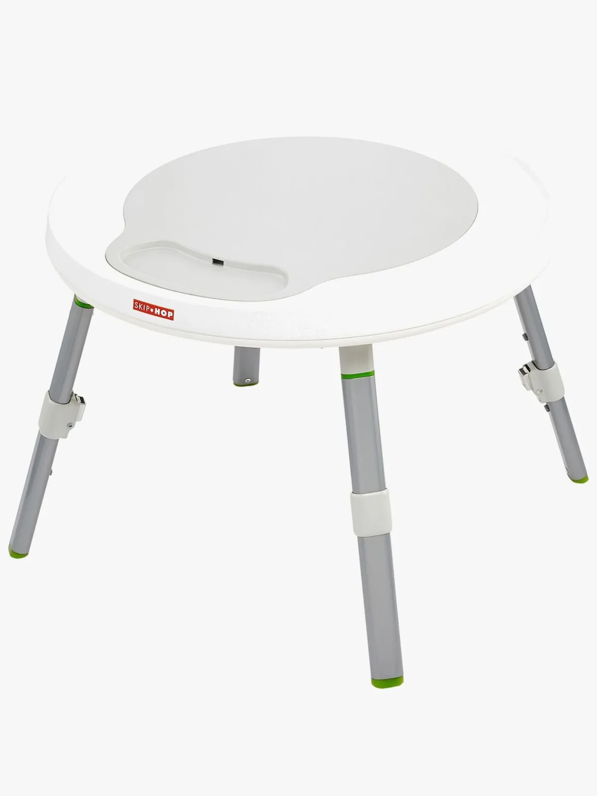 Sædet kan roteres 360 grader og det elastiske stof lader barnet støtte benene mod fodstøtten, der også kan justeres i højden. Legetøjet kan flyttes rundt på bordet efter smag og behag, og når barnet bliver større kan du tage alle legesager samt sæde væk, og lave aktivitetscenteret om til et almindeligt bord, hvor barnet kan sidde og lege. Foruden det sjove aktivitetslegetøj medfølger også en tallerken med sugekop på undersiden.