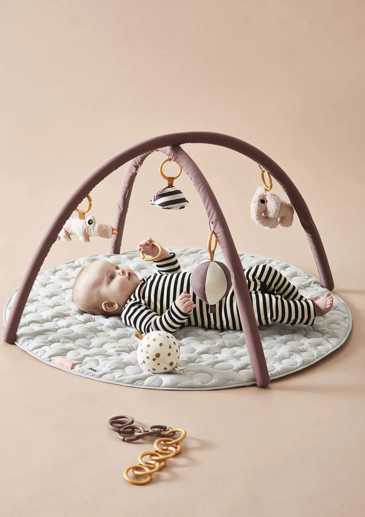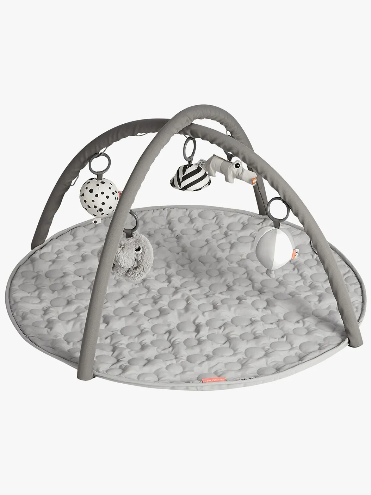 Legebøjlerne kan nemt sættes fast til tæppet via velcrolukning, så både tæppe og legetøj kan bruges separat.