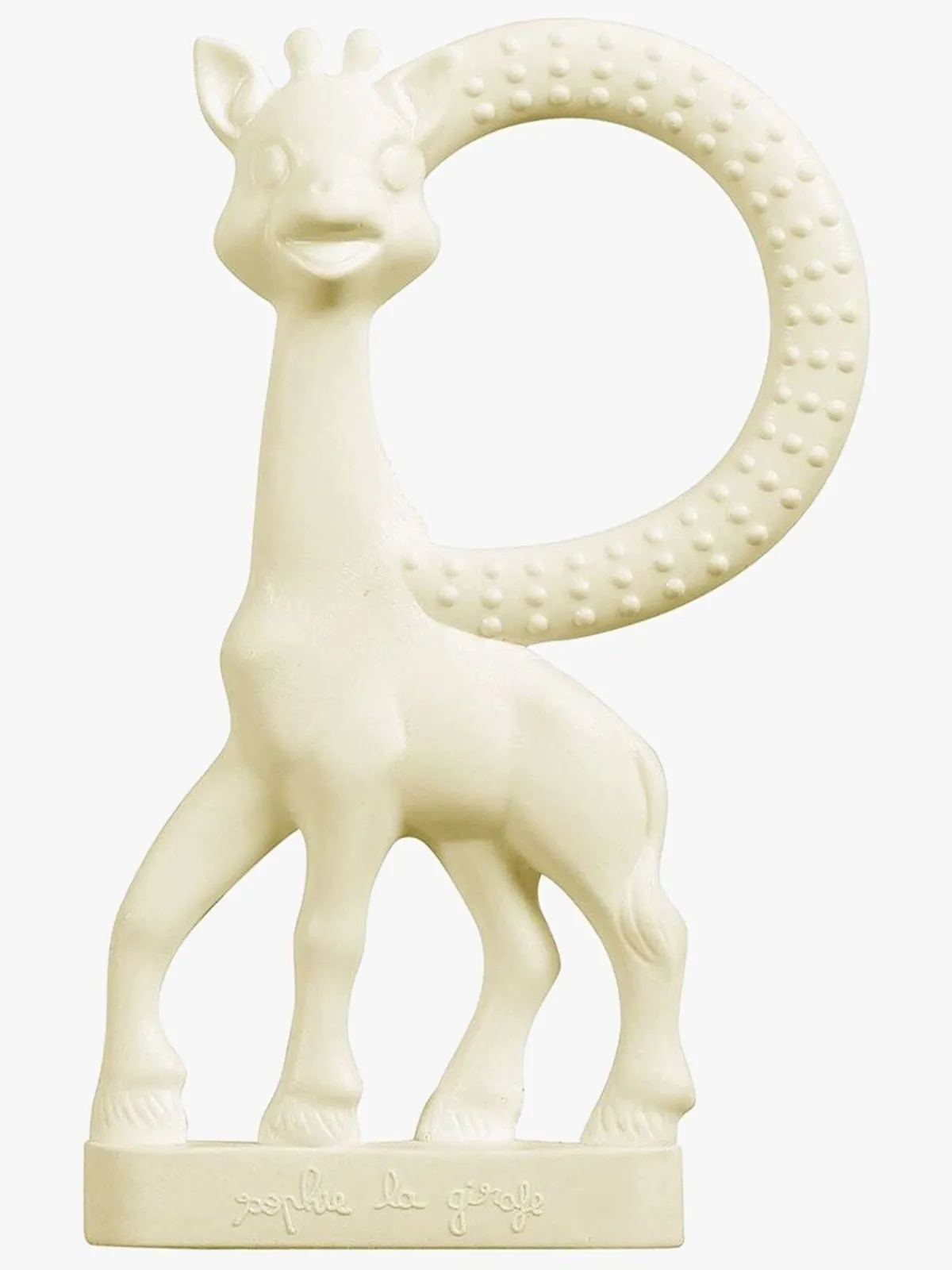 Giraffen er fleksibel, blød og har flere dele, der er dejlige at tygge på. Den lugter svagt af sødt naturgummi fra Havea-træet, som dit barn helt sikkert vil elske.