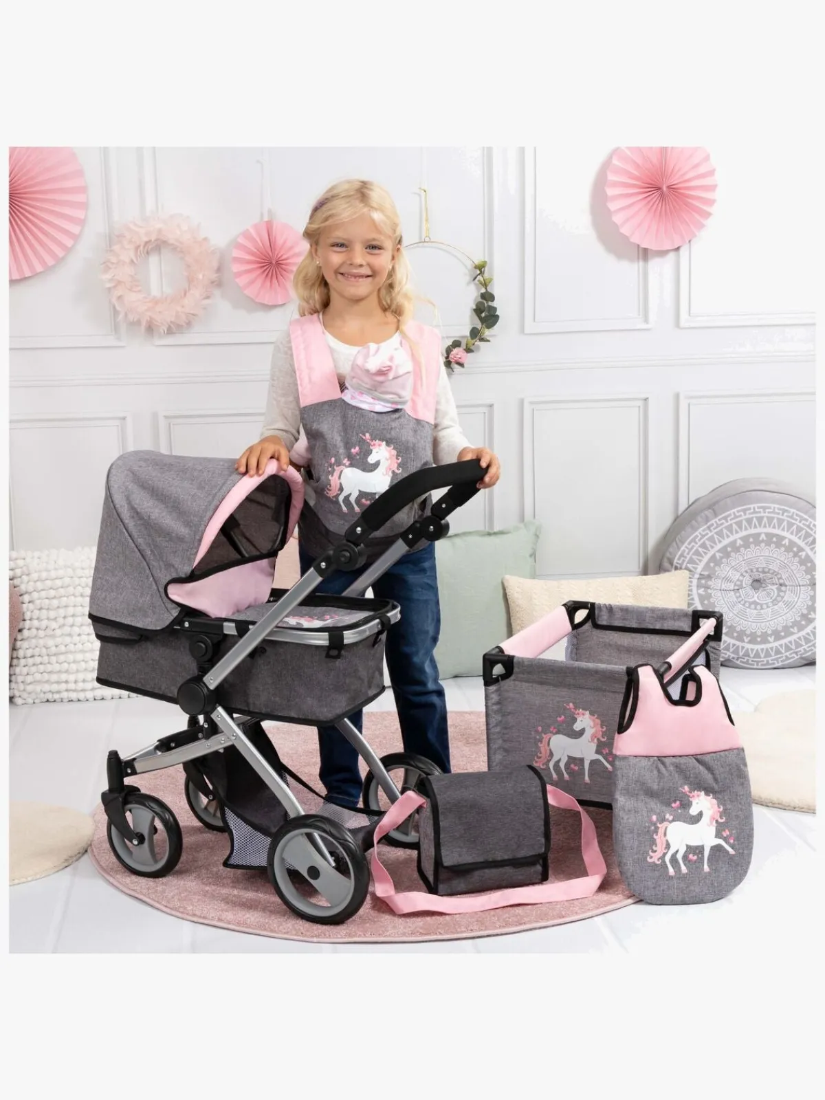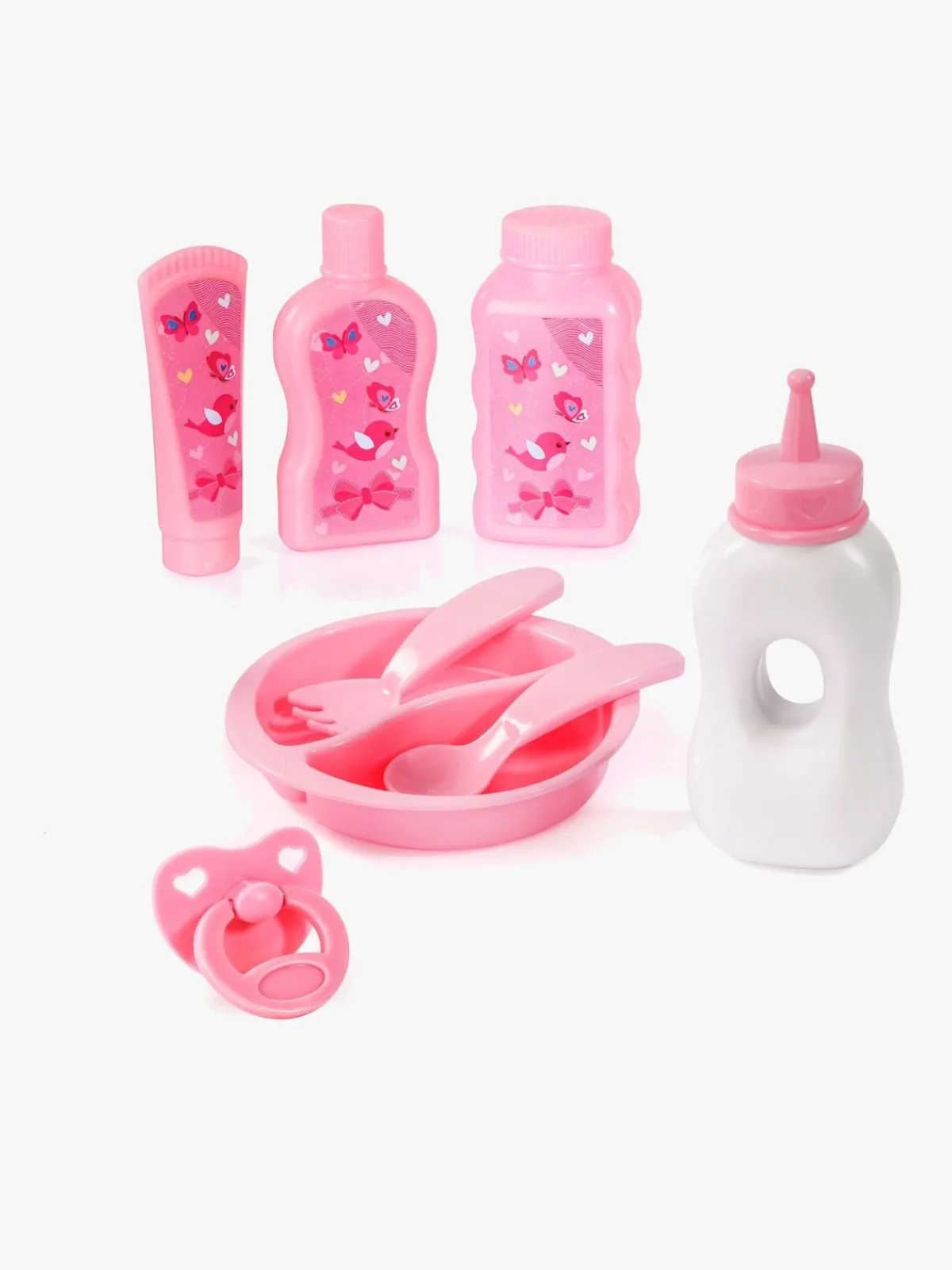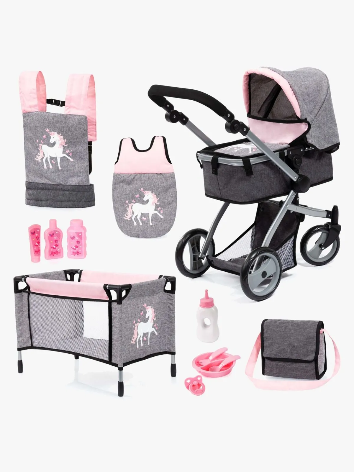 – Indeholder: 1 dukkevogn, 1 seng, 1 sovepose, 1 dukkebæresele, 1 tallerken, 2 bestik, 1 sutteflaske, 1 sut, 1 opbevaringstaske.