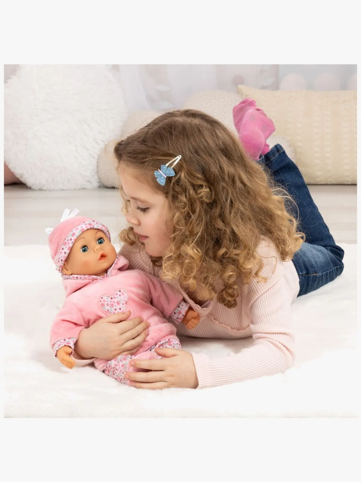 – Når du trykker på dukkens mave laver den forskellige babylyde. Fx griner eller græder den.