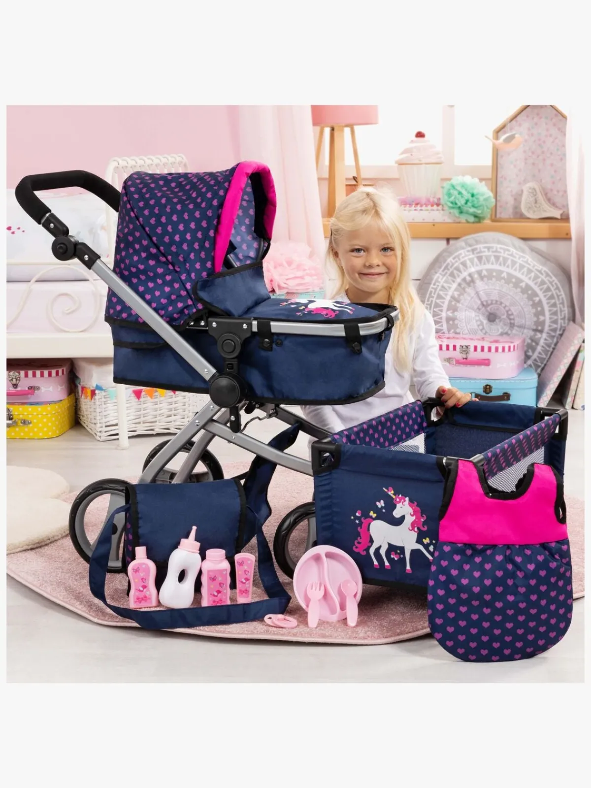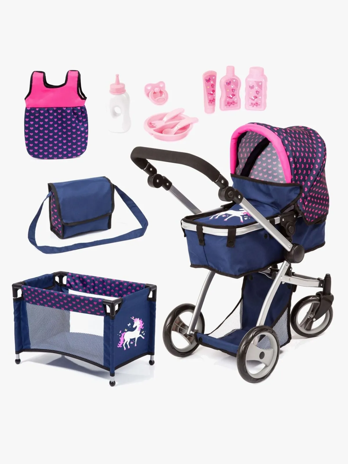 – Indeholder: 1 dukkevogn, 1 dukkeseng, 1 pusletaske, 1 sovepose, 1 sutteflaske, 1 sut, 1 tallerken, 2 bestik, 1 babyplejesæt.