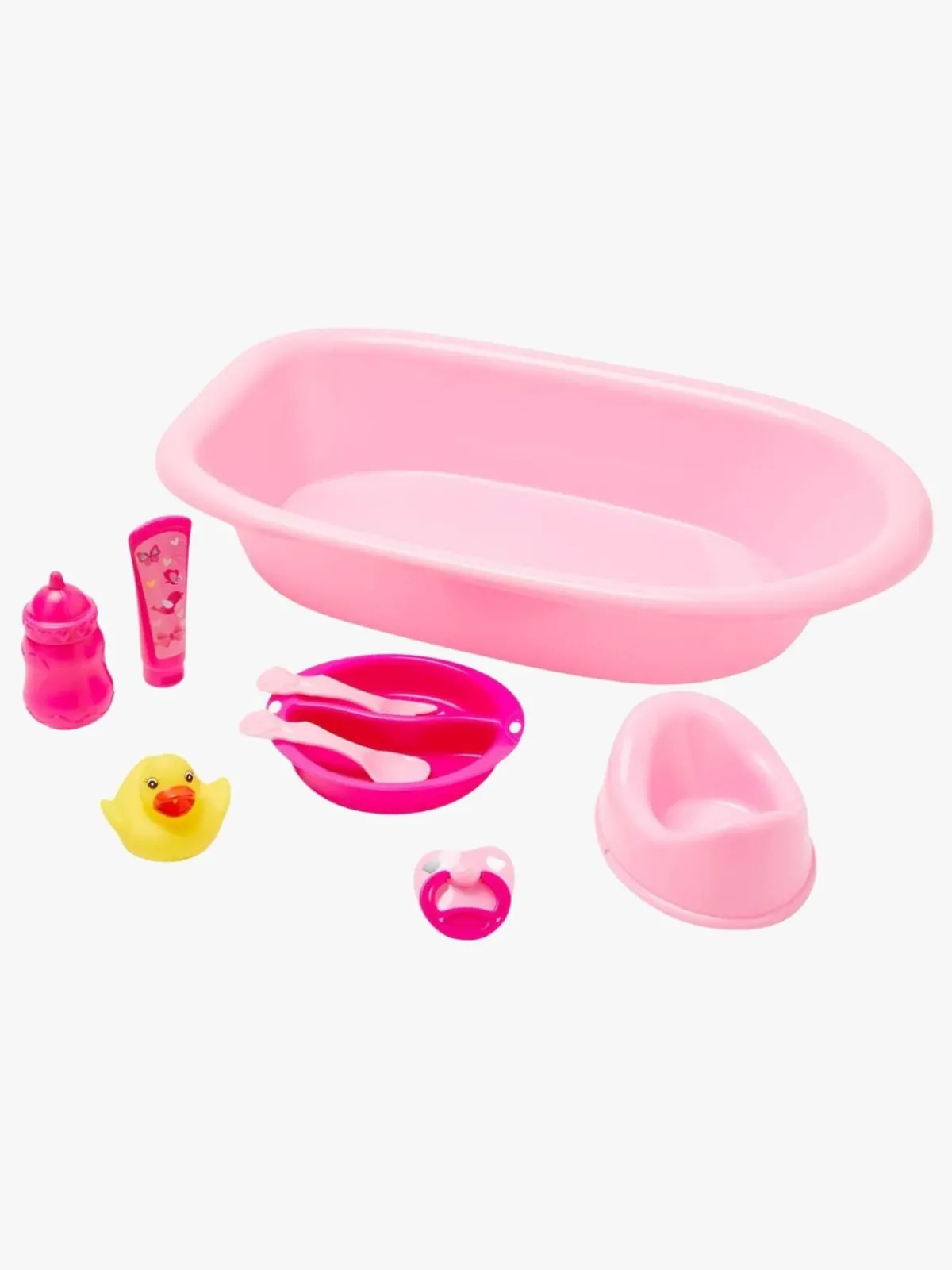 – Indeholder: 1 potte, 1 badekar, 1 gummiand, 1 sut, 1 tallerken, 2 bestik, 1 sutteflaske, 1 sæbeflaske.