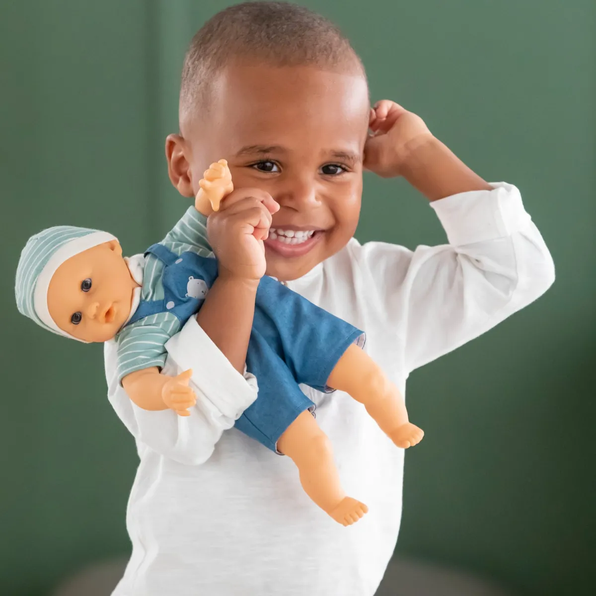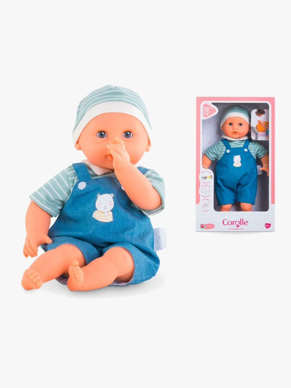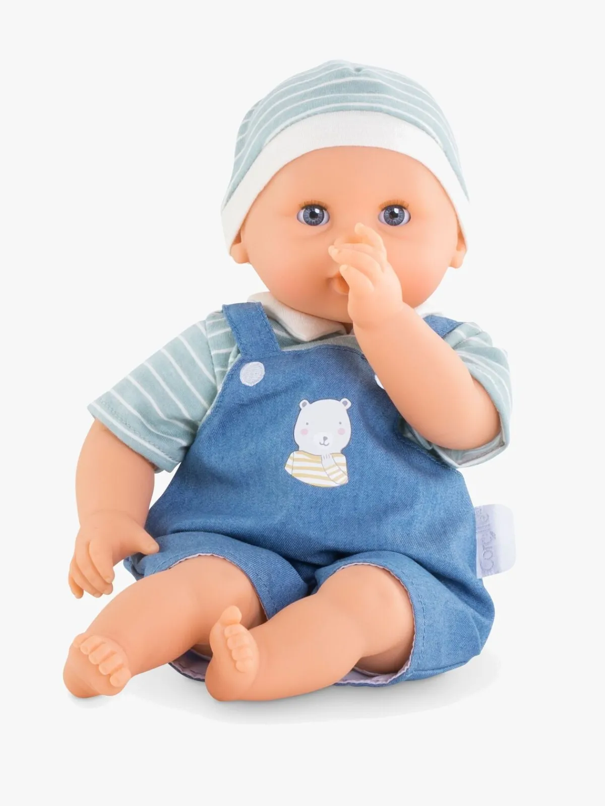 – Klædt i blå selebukser og en sød stribet t-shirt med matchende hue.