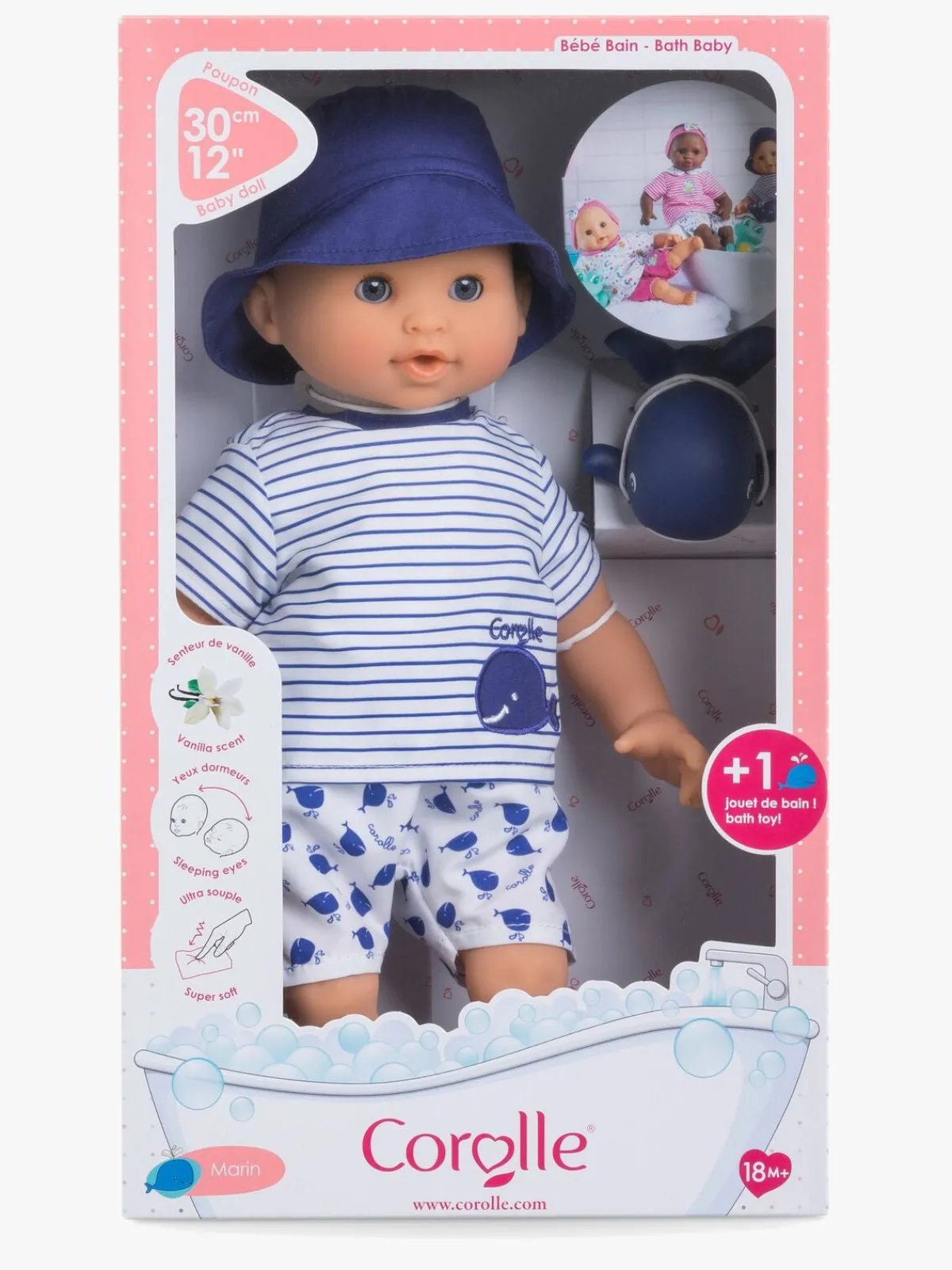 – Dukken er klædt i en stribet skjorte og shorts og en matchende solhat.