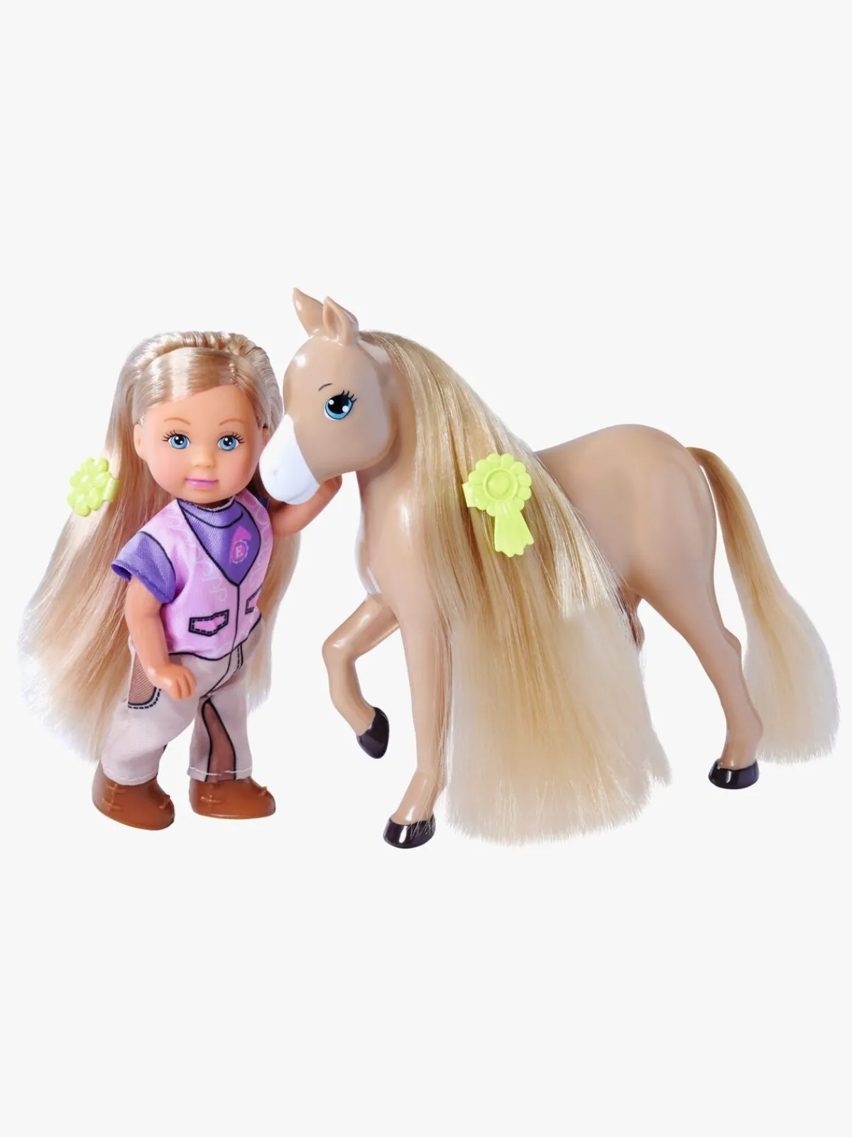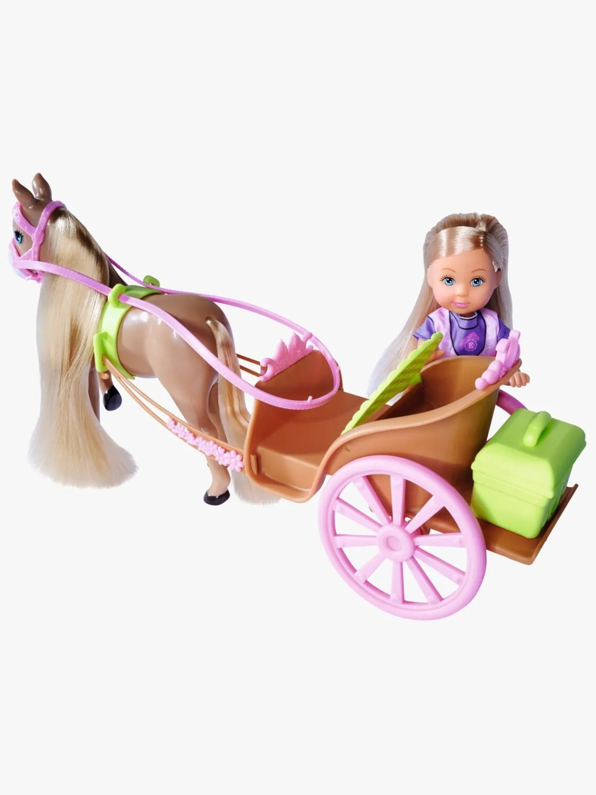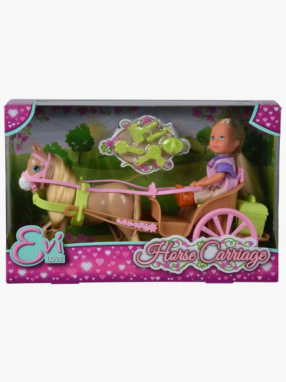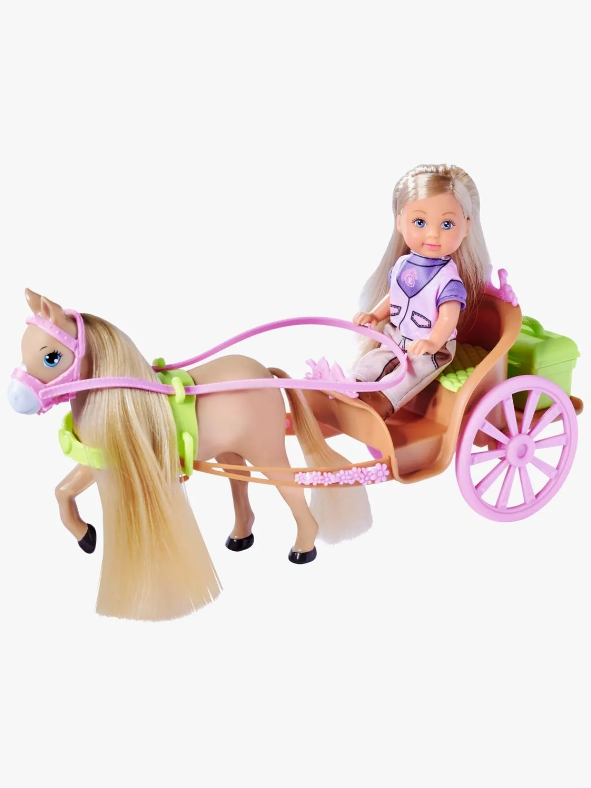 – Indeholder: 1 Evi-dukke, 1 hest, 1 hestevogn, 1 opbevaringstaske, 5 hestetilbehør.