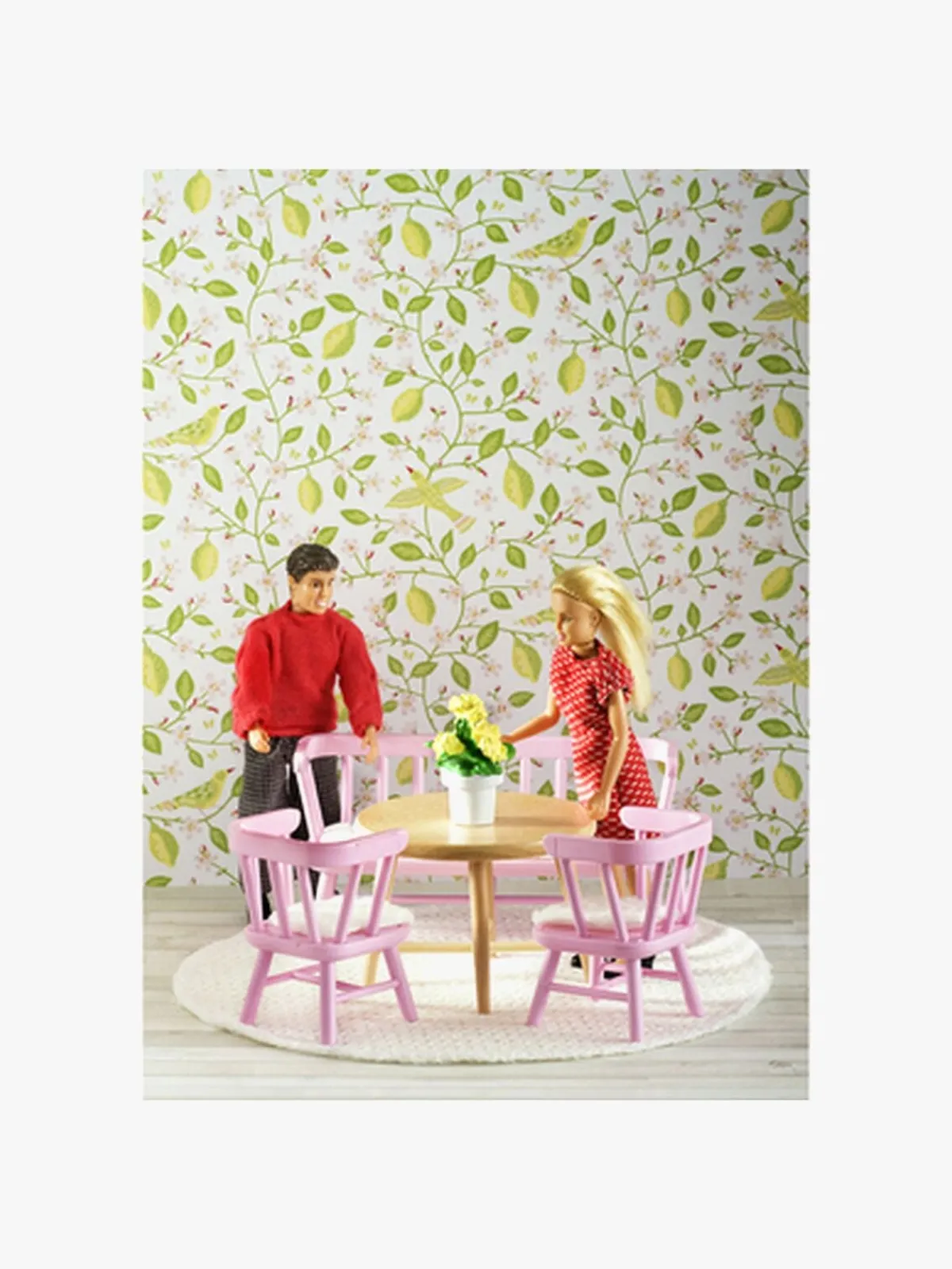 Desuden medfølger et lille gulvtæppe og en blomst, som kan pynte på bordet.