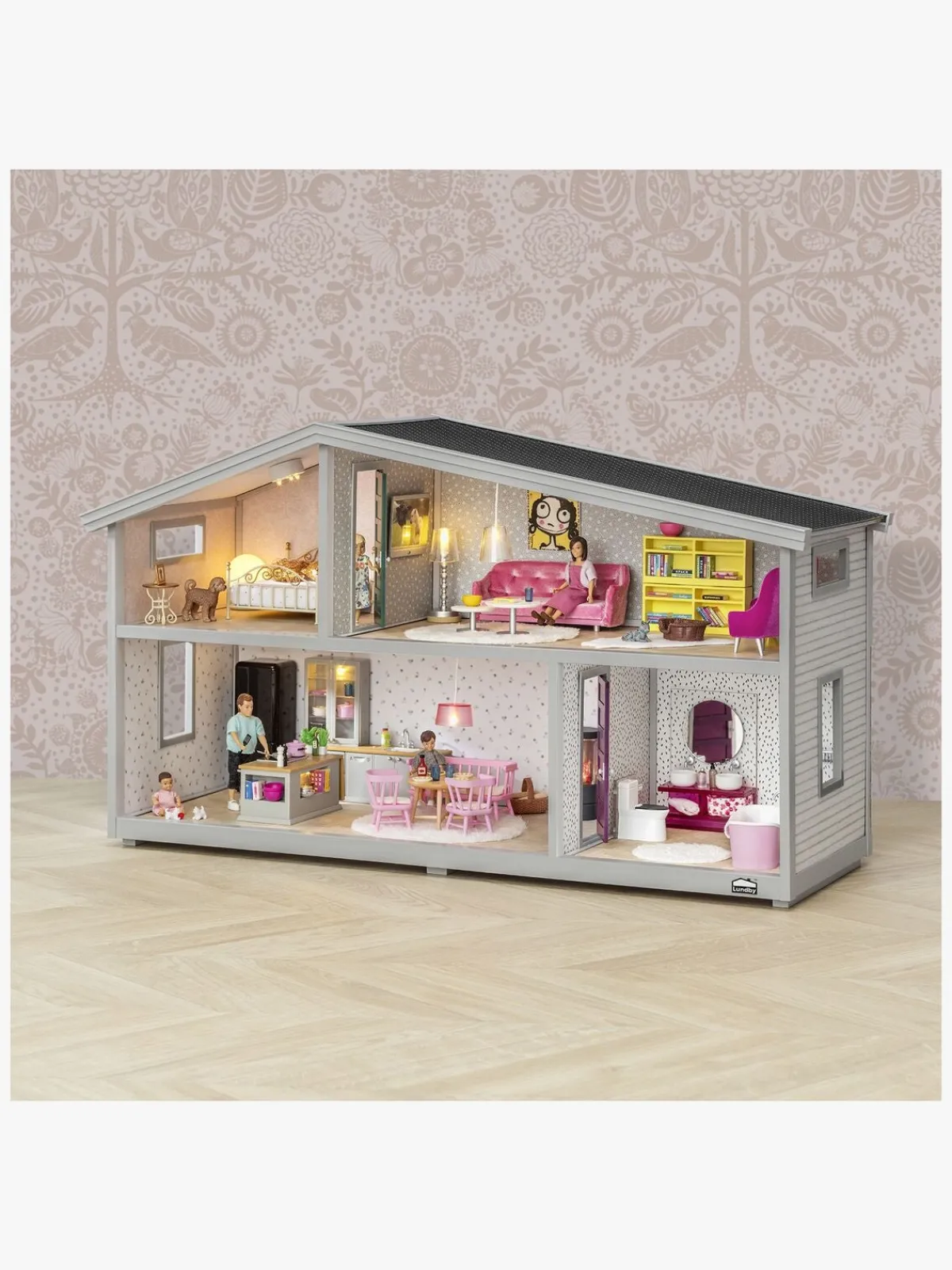 Væggen bagerst kan tages væk, så du kan lege fra både for- og bagsiden. Du kan desuden tilbygge huset med dukkehusmoduler fra Lundby Room – så er der plads til hele din dukkehusfamilie!