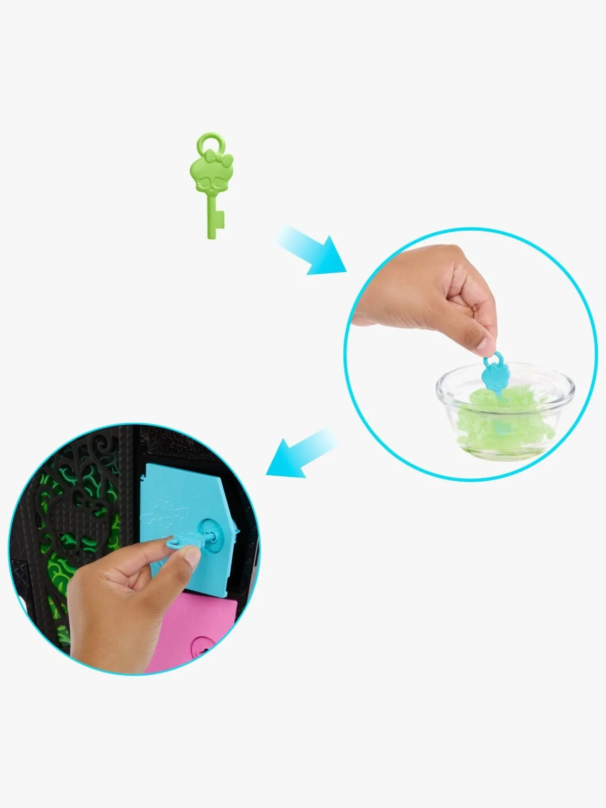 – Indeholder: 1 dukke, 1 kisteformet skab, 4 Color Reveal-nøgler, 15 stk. tilbehør.