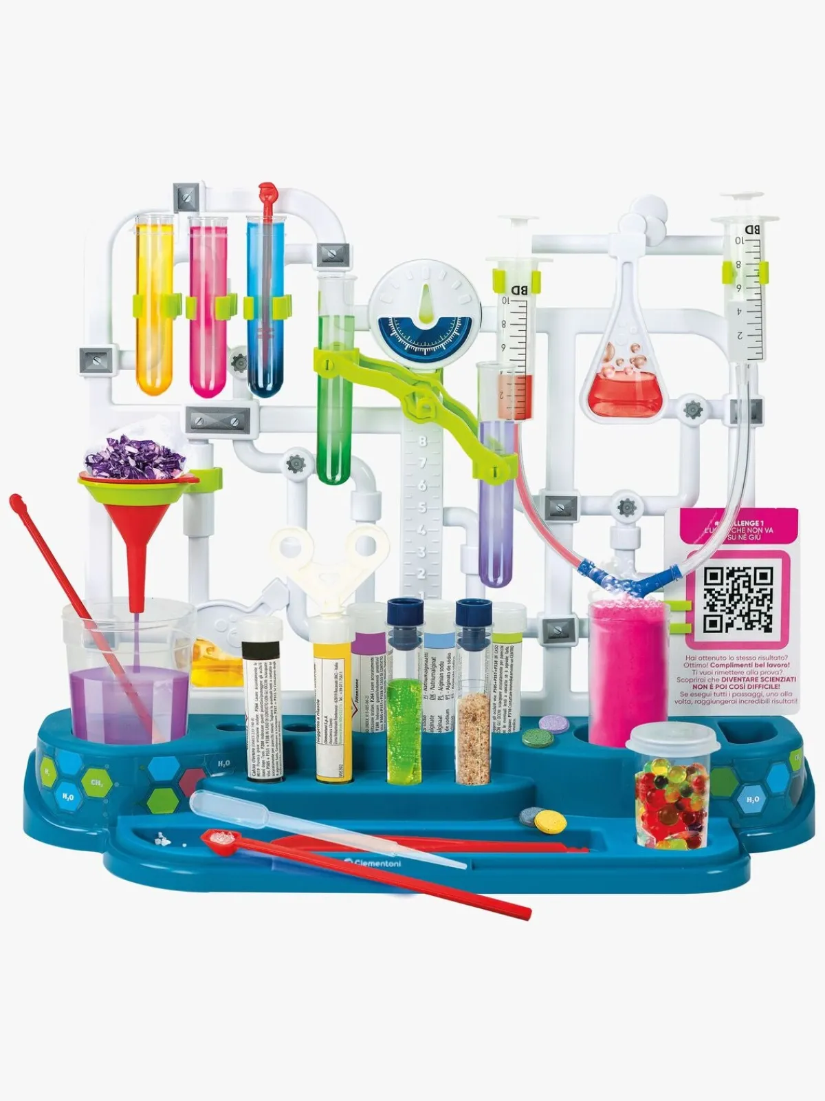 – Indeholder: beskyttelsesbriller, handsker, gennemsigtige rør, forskellige kemikalier, petriskål, reagensglas med låg, farverige klistermærker, tragt, forskellige redskaber, udfordringskort og andet passende tilbehør.