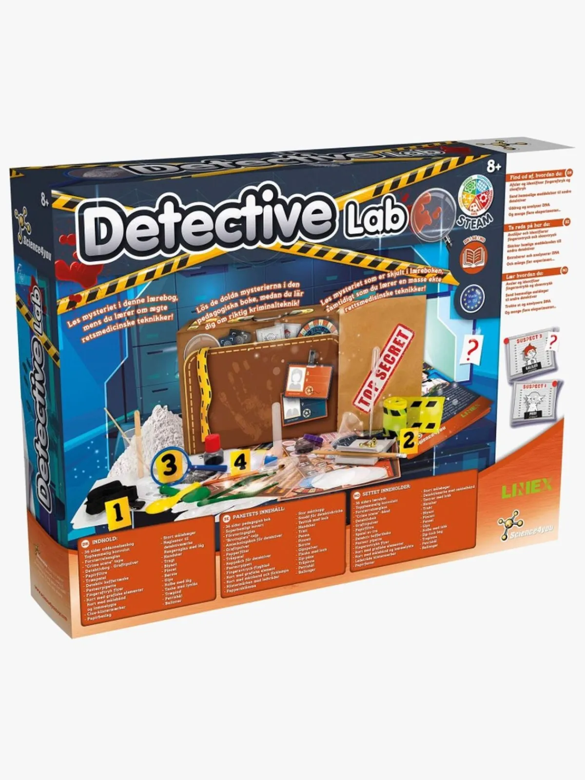 Inkluderer: tape til gerningssted, forstørrelsesglas, fingeraftryksbørste, uddannelsesbog og mere.