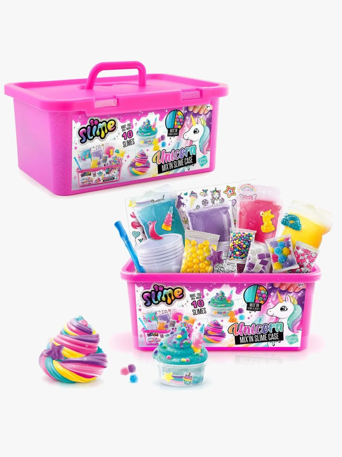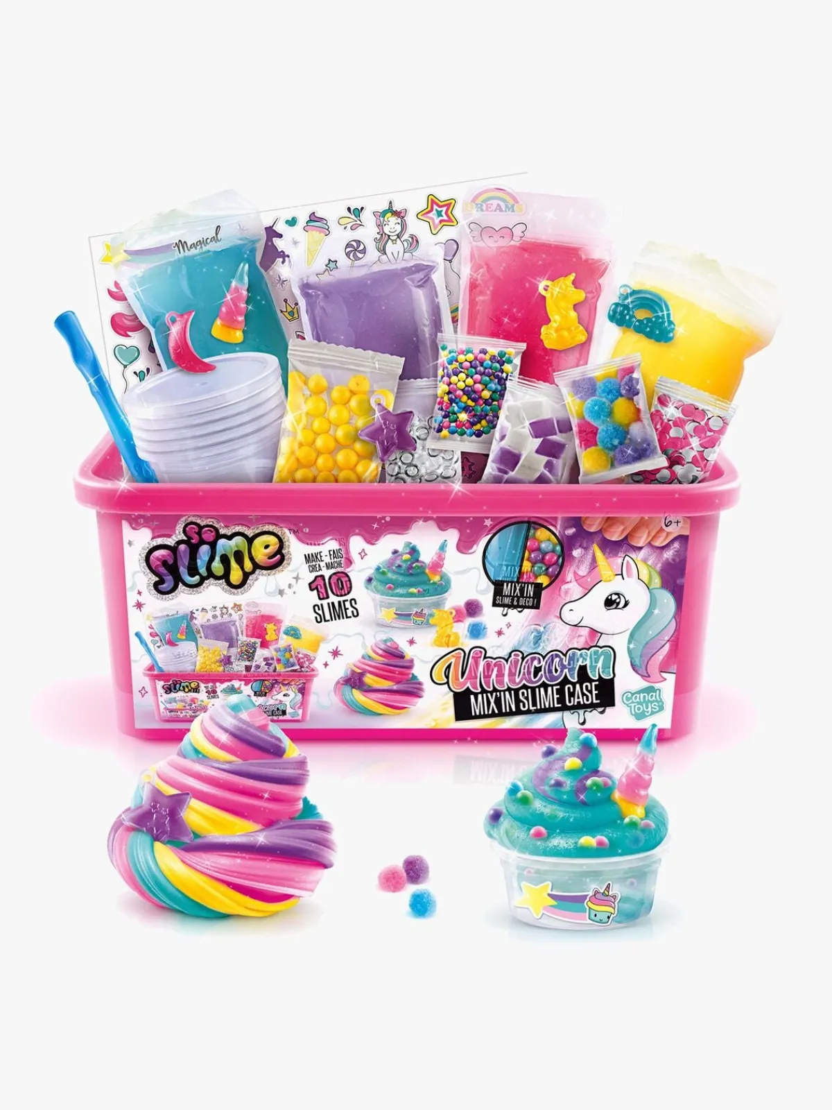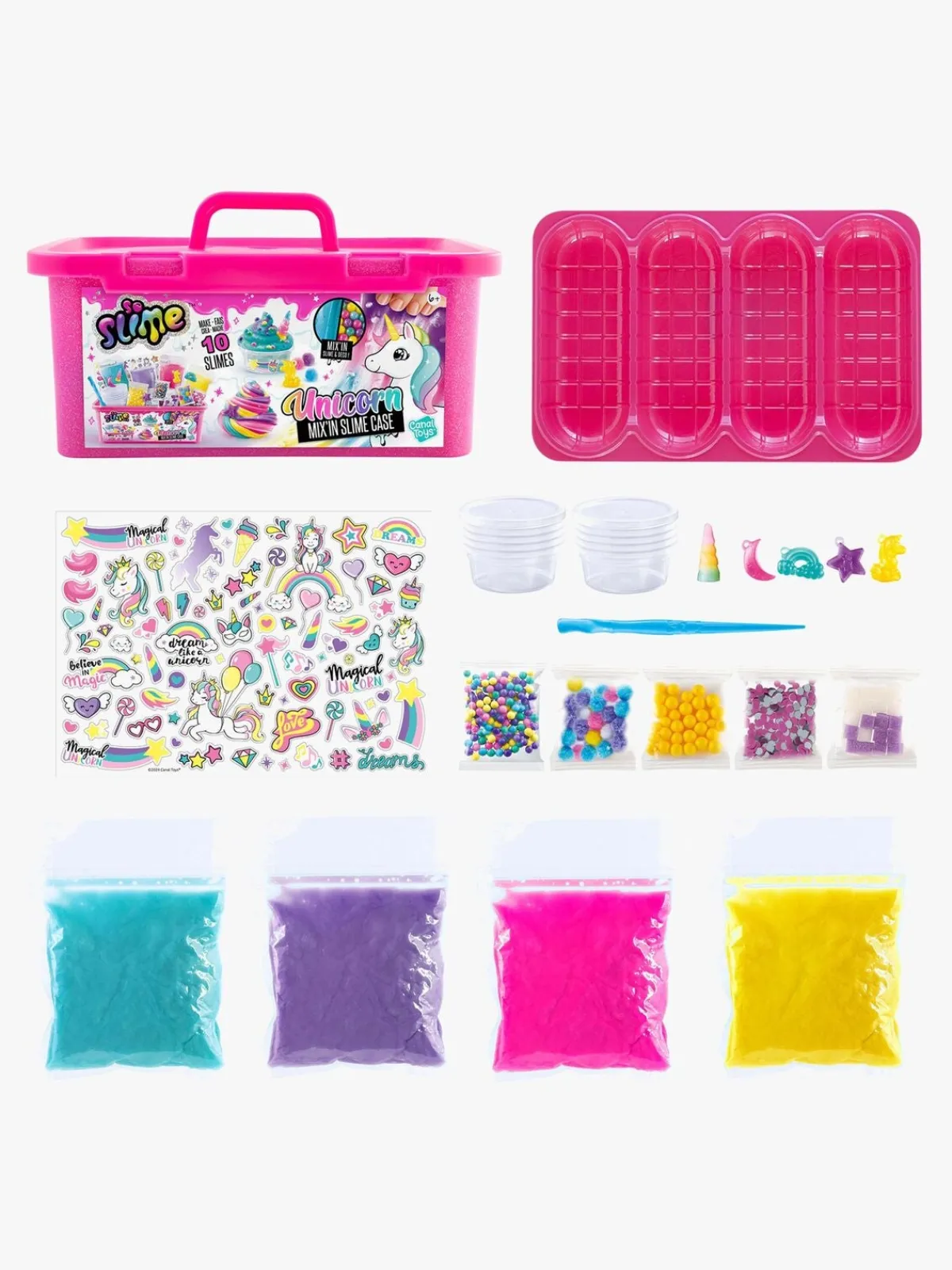 – Indeholder: 1 kasse med håndtag, 4 slime, 10 beholdere, 1 blandeværktøj, 7 poser med dekoration, 4 vedhæng, 1 klistermærkeark, 4 blandeskåle.