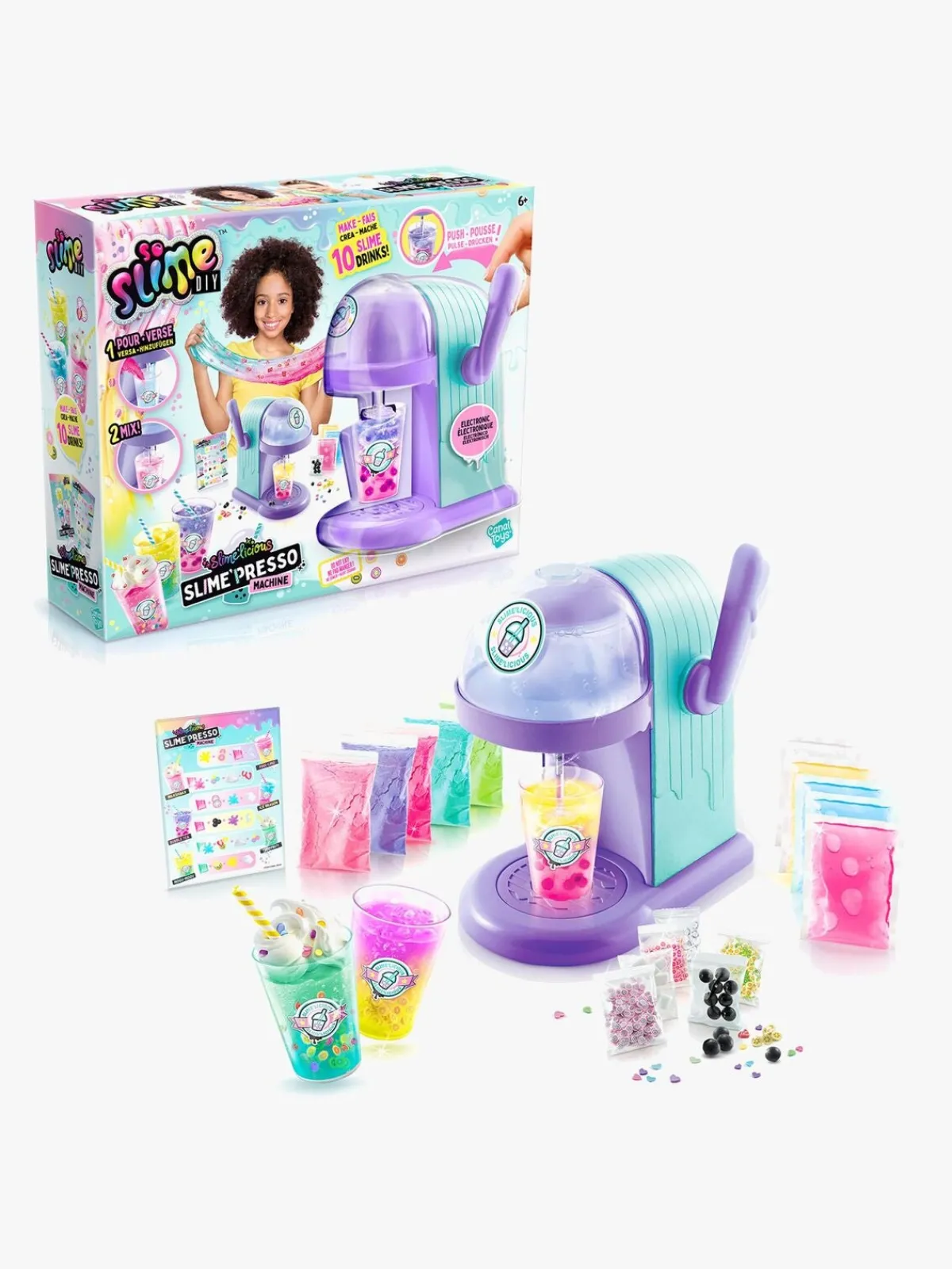 – Indeholder: 1 elektrisk blender, 2 piberensere, 1 opskriftskort, 10 slimepulvere, 5 slime, 3 kopper, 8 poser med pynt, 3 sugerør.