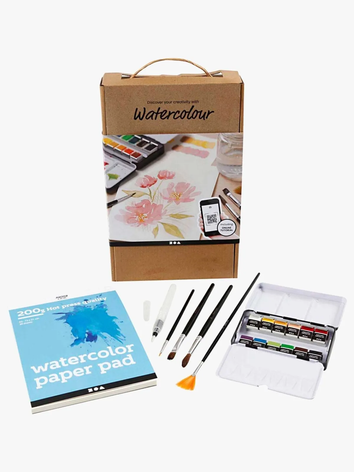 I pakken, er der også en QR-kode, som ved scanning fører dig videre til en detaljeret instruktionsvideo, der introducerer flere forskellige akvarelmalingsteknikker. Det perfekte sæt til nybegynderen!
