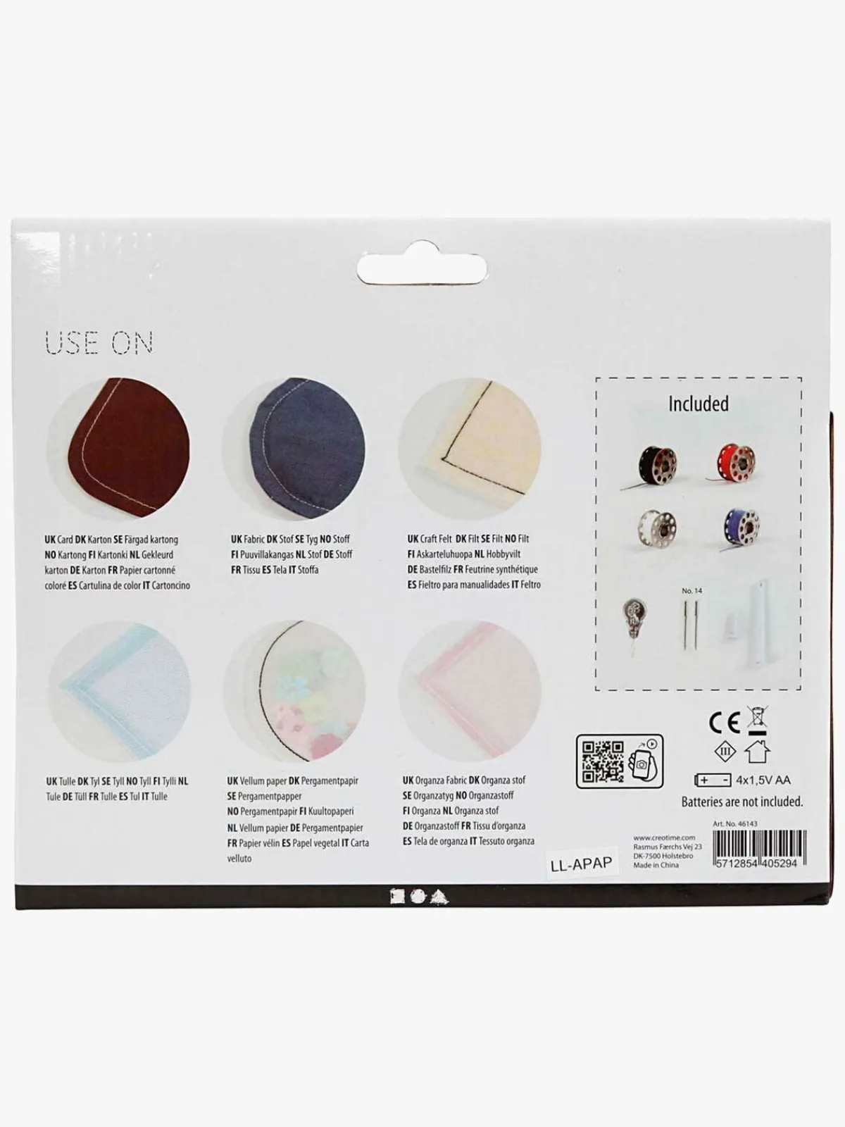 OBS: denne symaskine kan ikke erstatte en almindelig symaskine, da denne ikke syr med undertråd og også har andre begrænsninger. Er bedst egnet som supplement.