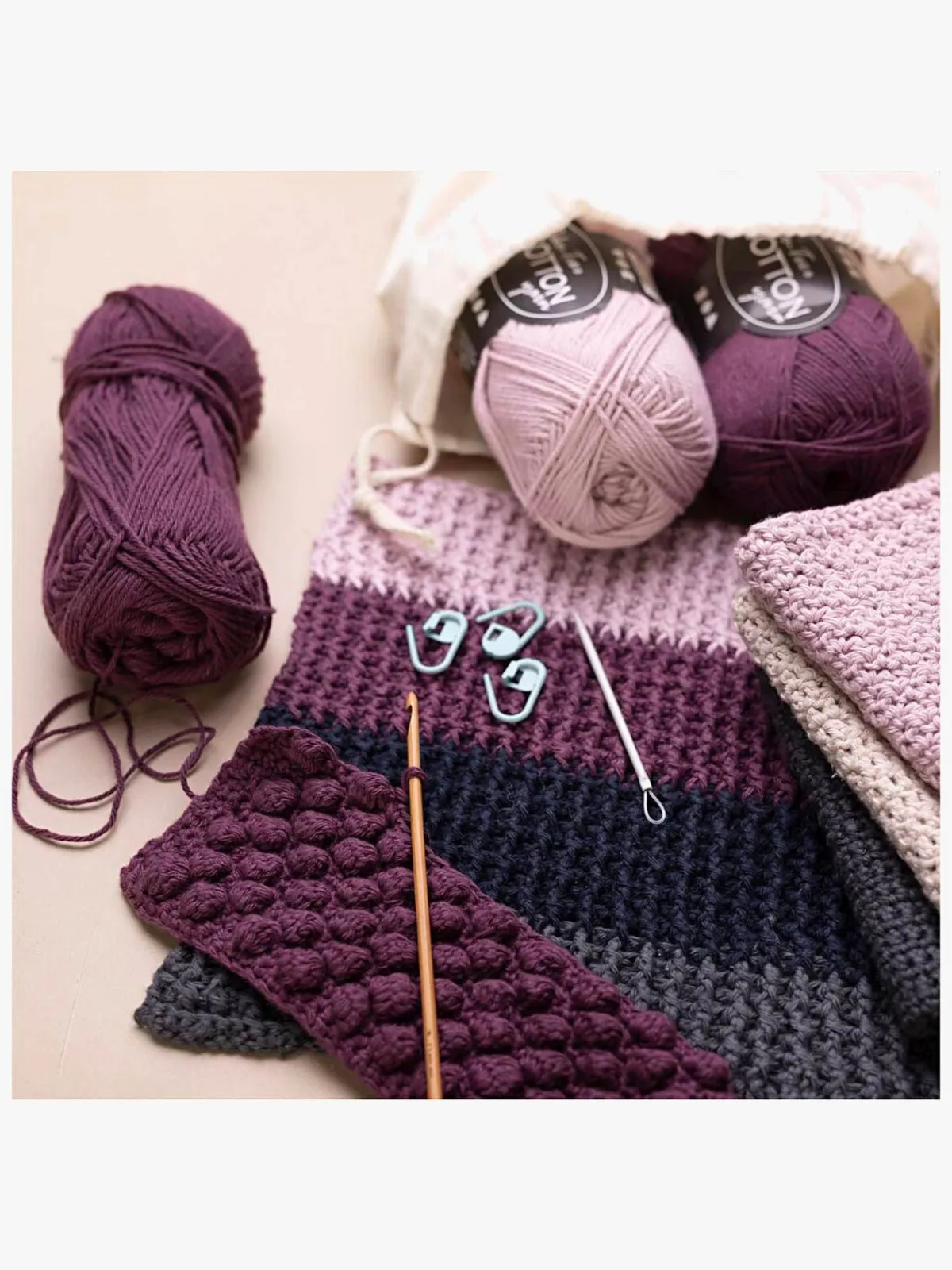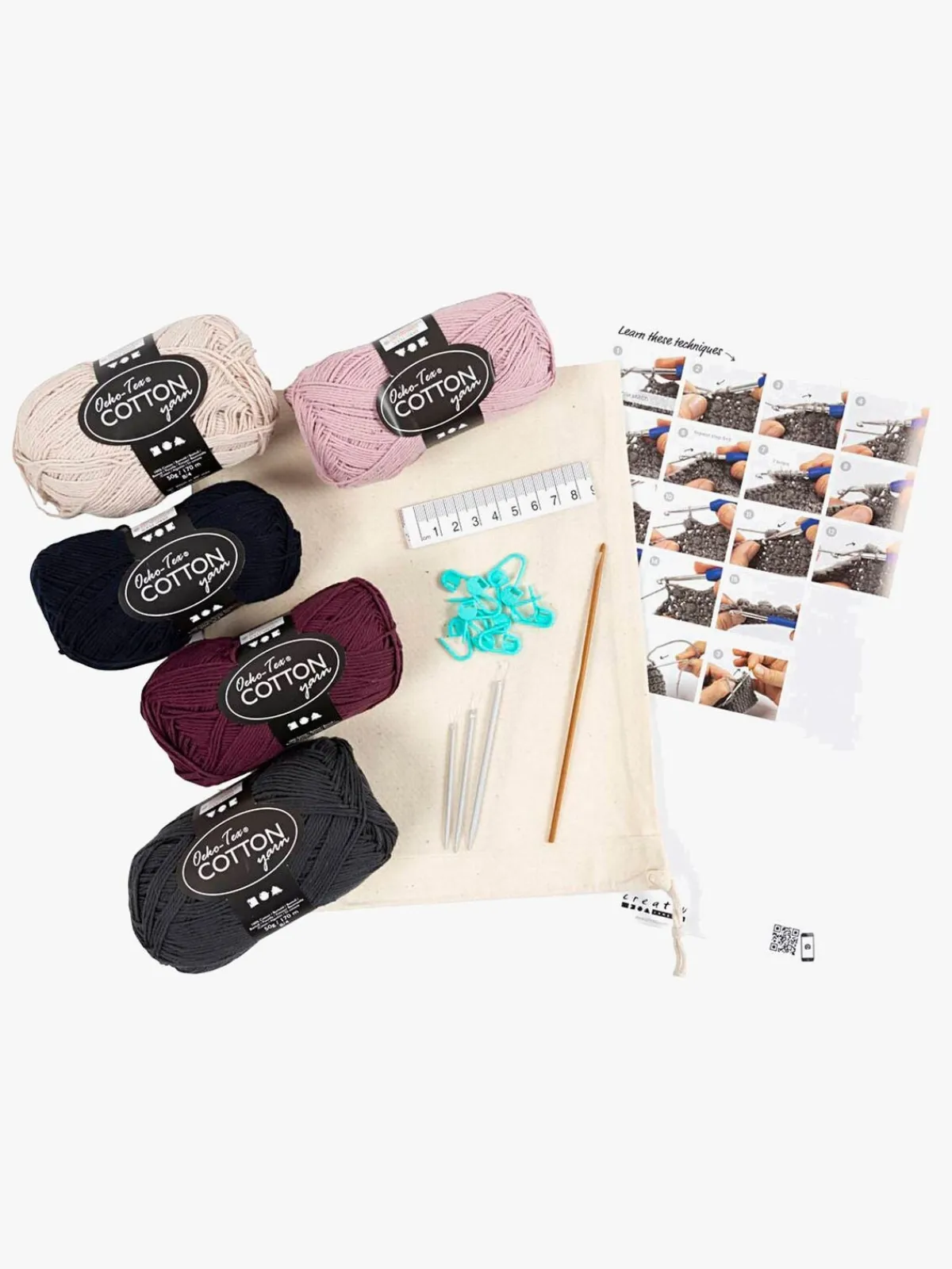 – Indeholder: bomuldsgarn, hæklenål nr. 3, målebånd, garnnåle og stofpose.