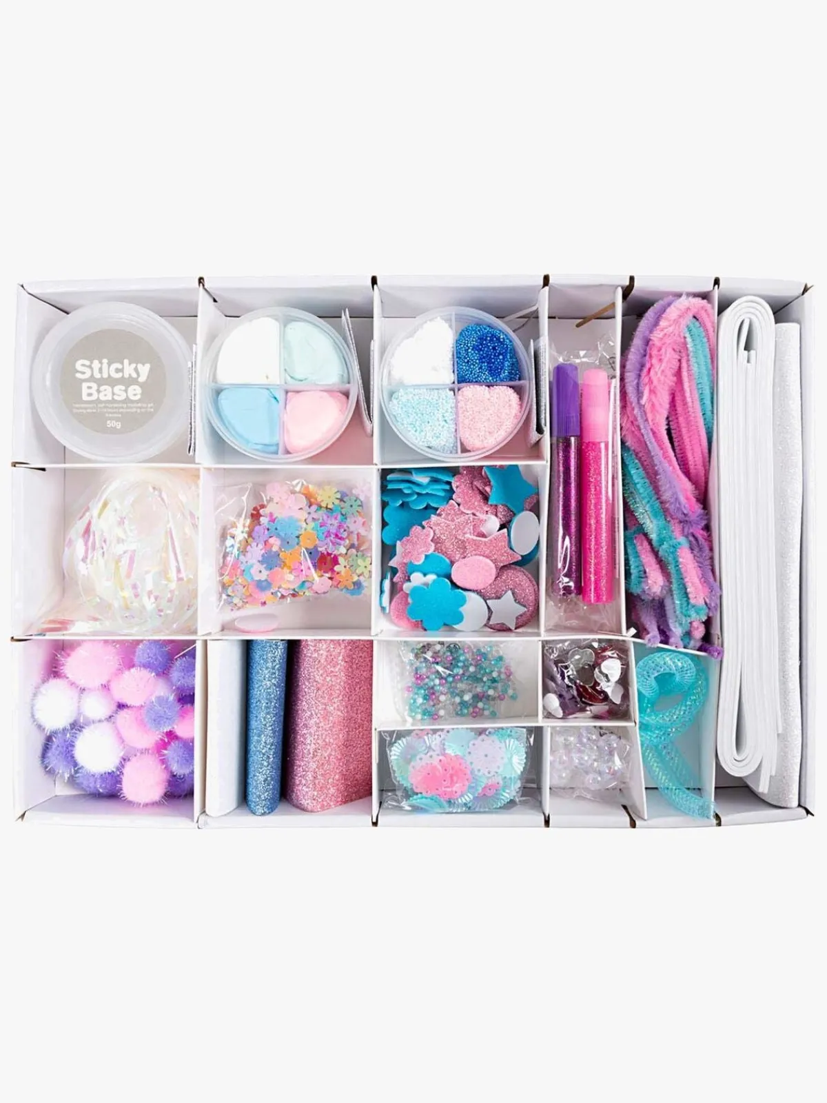 – Indeholder: glitterskum, piberensere, glitterrengøring, Foam Clay, Silk Clay, Sticky Base, blomsterpailletter, regnbuskinnende plastikstrips, plastiktube, rhinsten, perler, glasperler, runde pailletter, glitterpapir, garnruller.