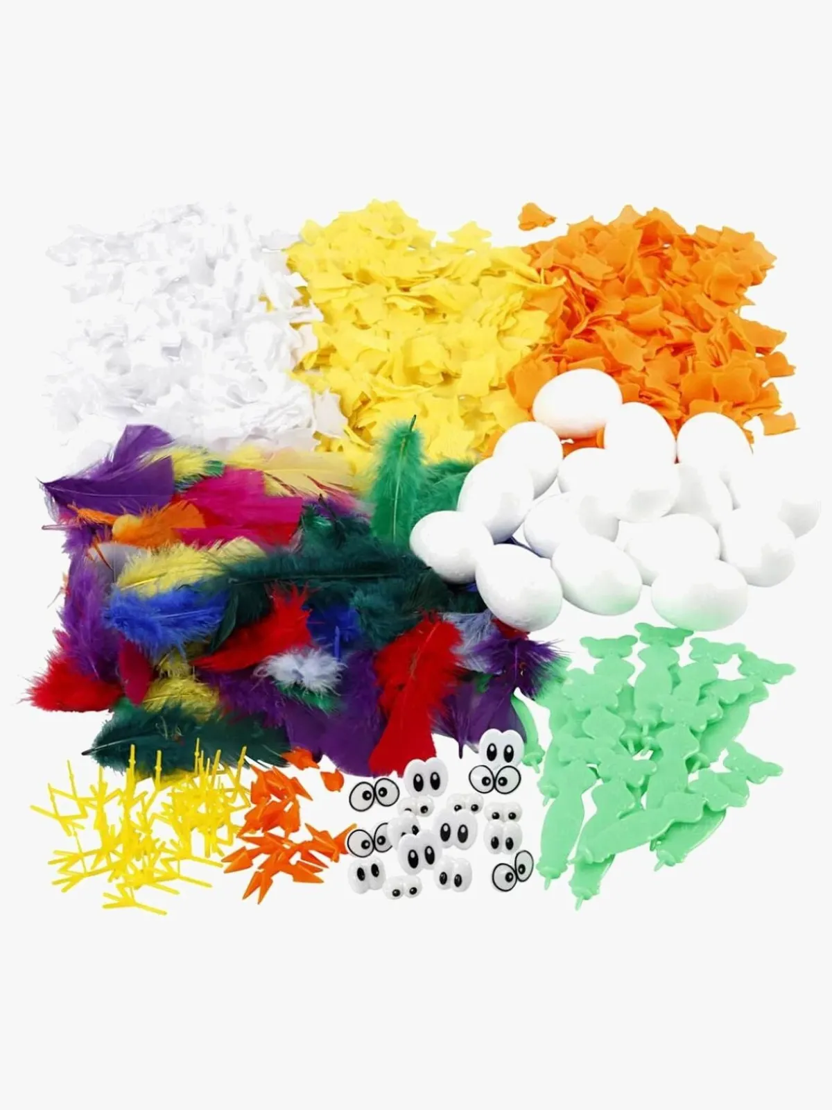 Materialesæt fra Creativ Company med et medfølgende værktøj. Det har næb og fødder i plastik. Materialesættet har kroppe i flamingo, fjer, stof og filt. Sættet indeholder alt det, du skal bruge til at lave påskekyllinger med!