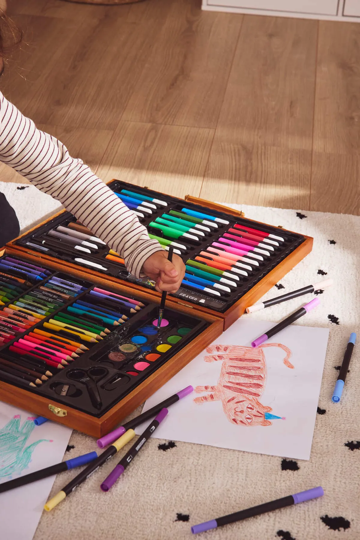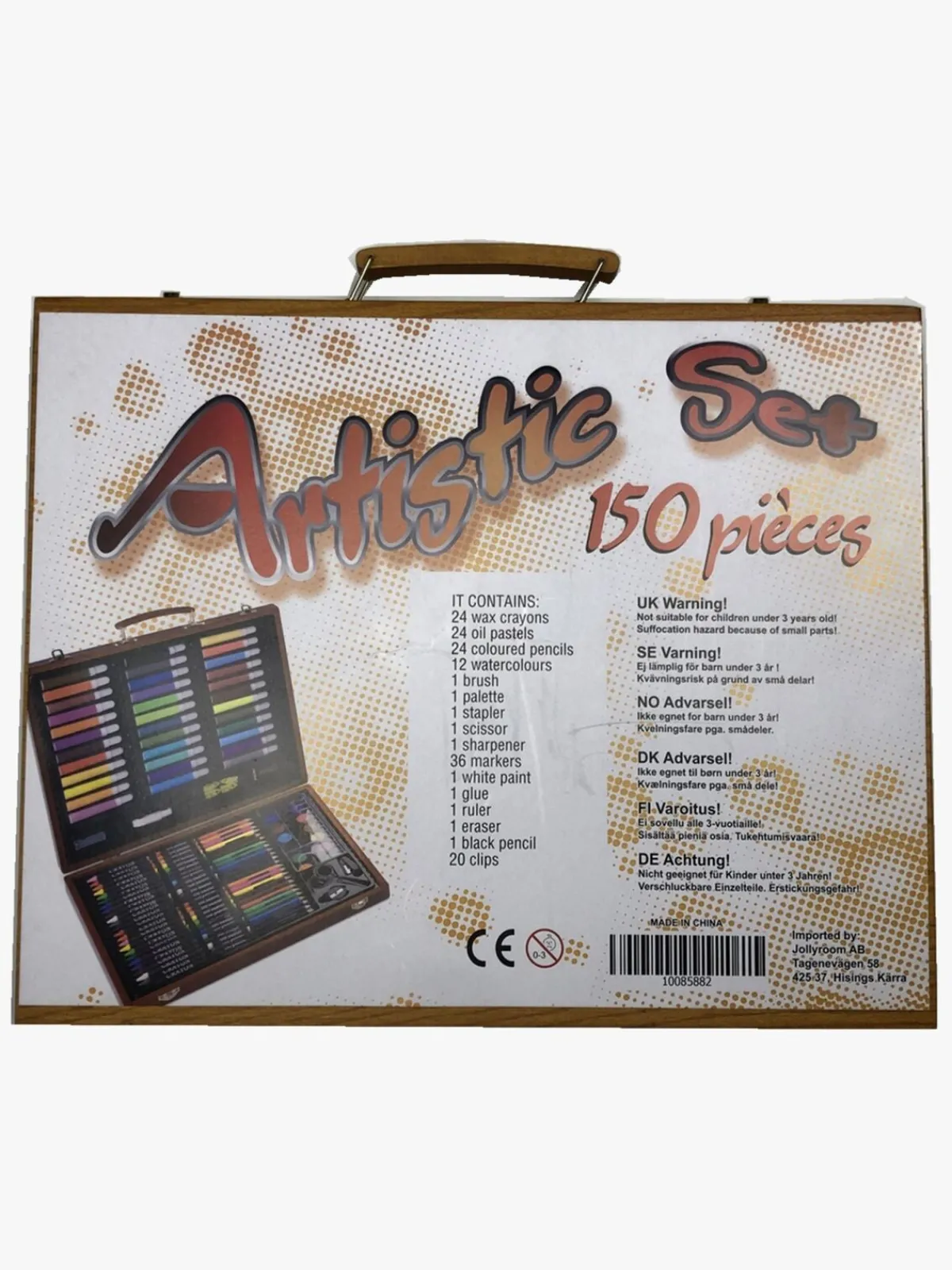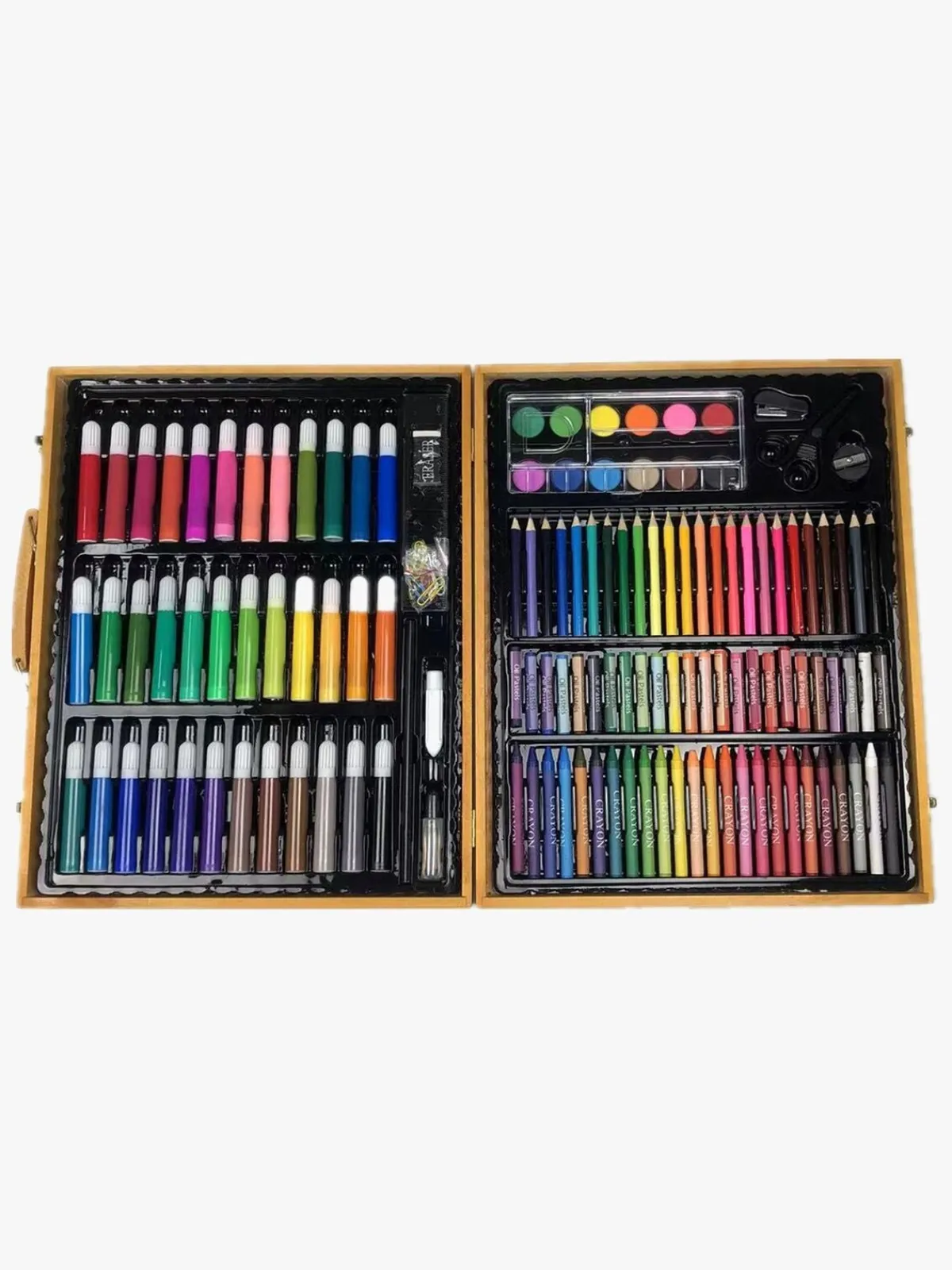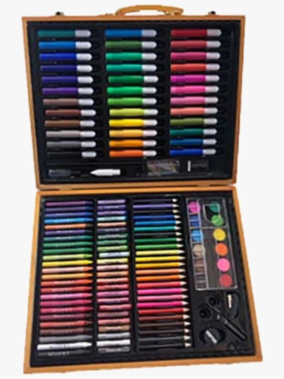 – Indeholder 36 tuscher, 12 vandfarver, 24 stk. pastelkridt, 24 stk. kridt, 24 farveblyanter, clips, en vandbaseret hvid farve, pensel, blyantspidser, blyant, en palet, en svamp, en lineal, en saks og en flaske lim.