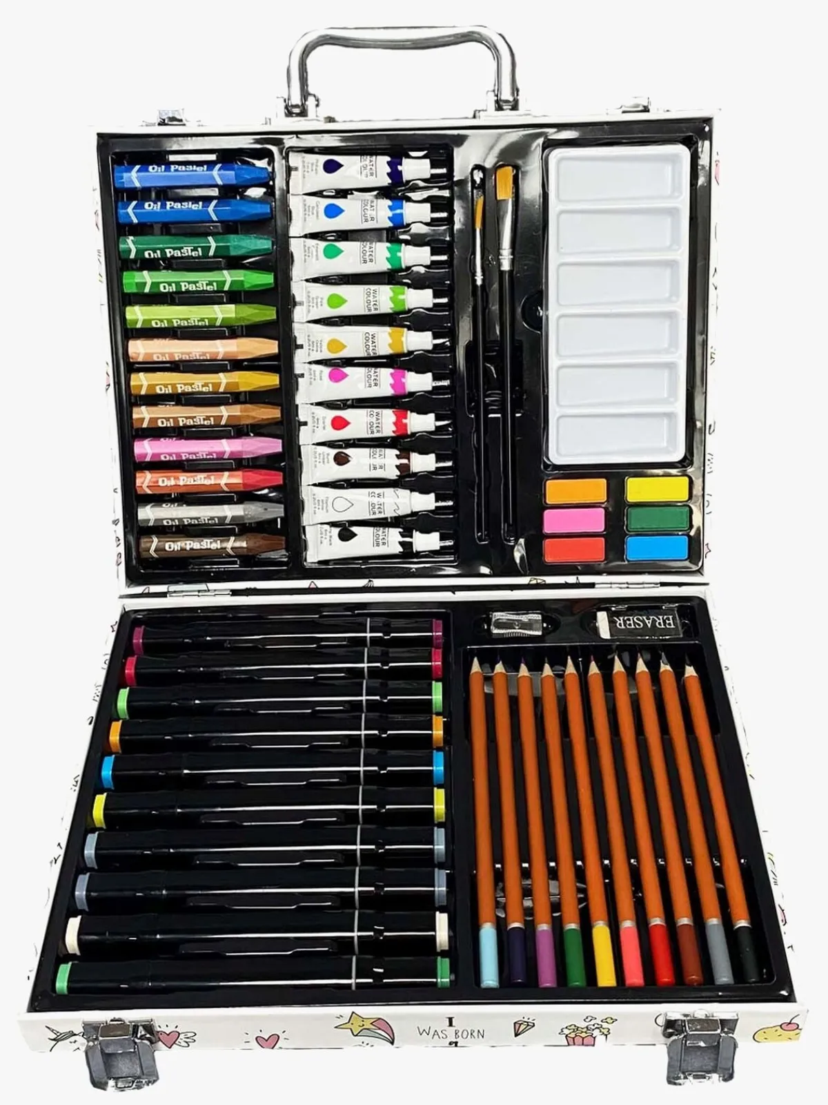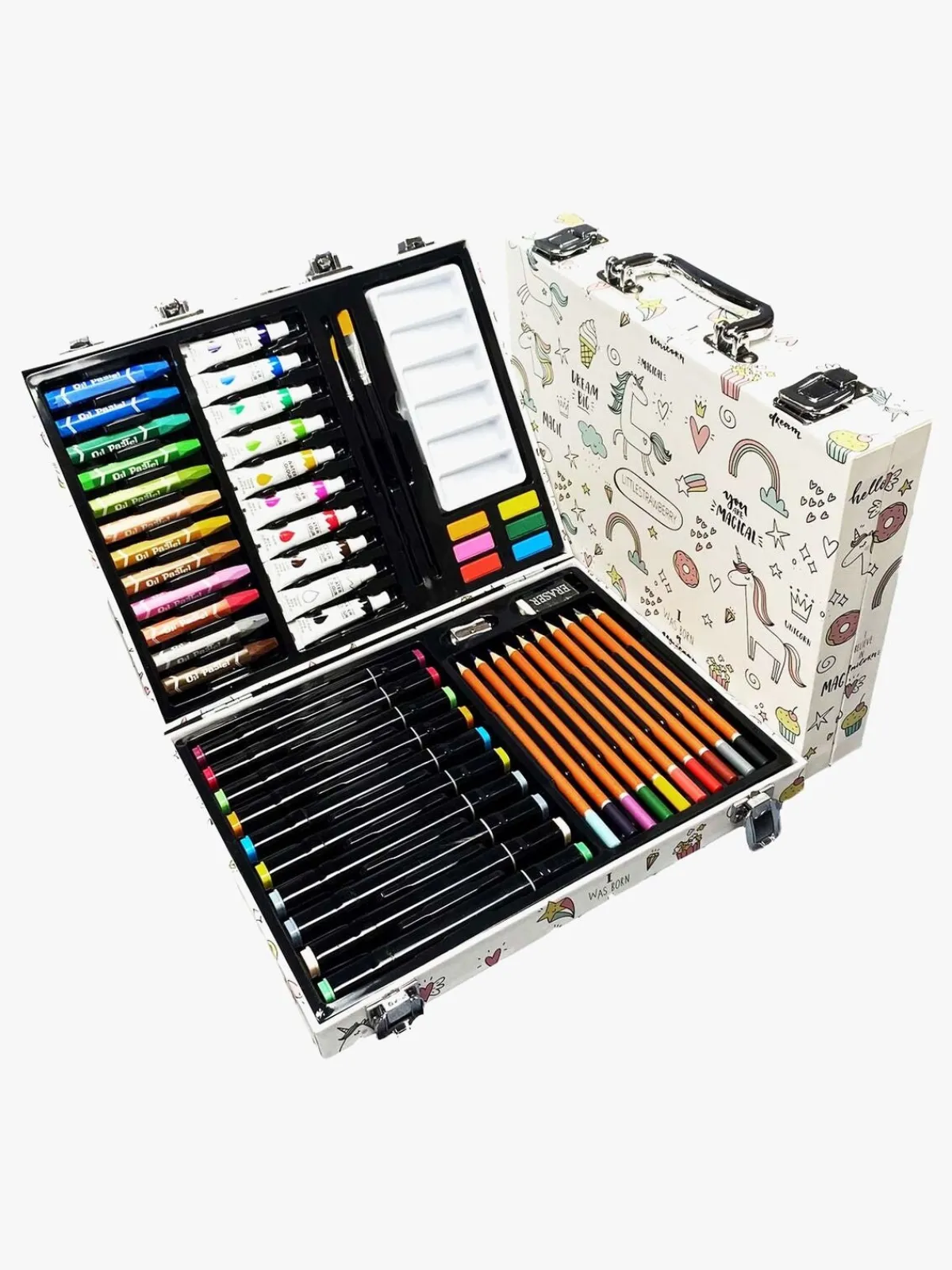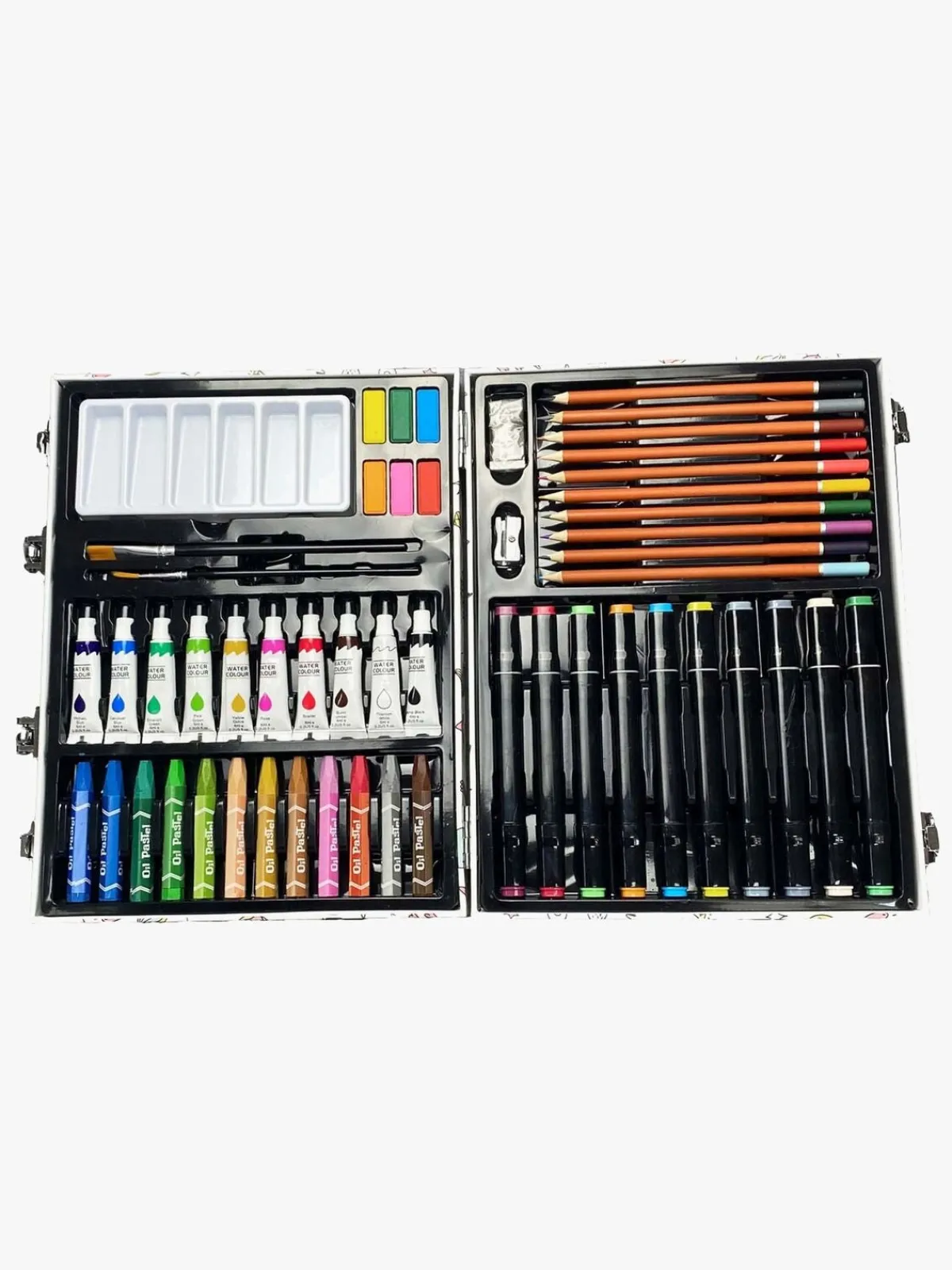 – Indeholder: 10 vandfarver, 6 fibertusser, 10 oliepastelfarver, 12 vandfarvetuber, 10 børster, 2 viskelædere, 1 1 blyantspidser, 1 palet.