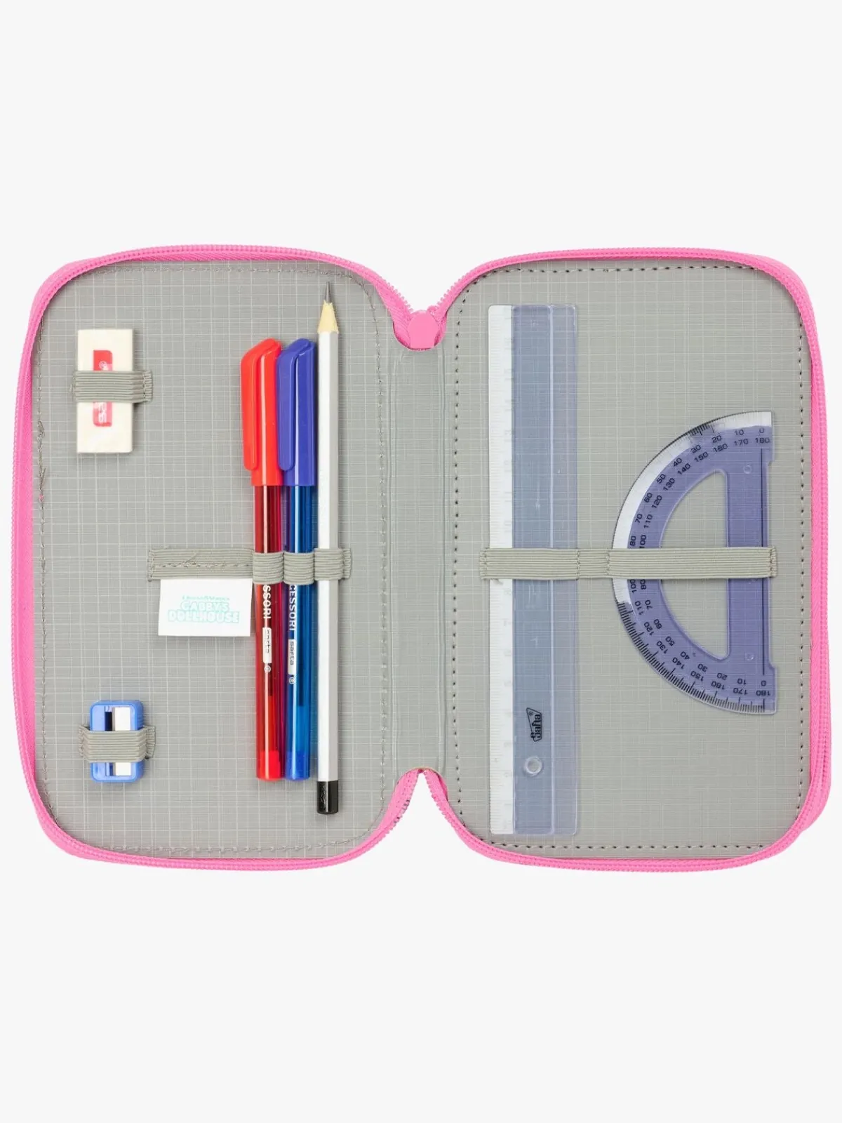 – Indeholder: 1 penalhus, 1 viskelæder, 1 blyant, 2 kuglepenne, 1 blyantspidser, 2 linealer, 16 farveblyanter, 14 tusser.
