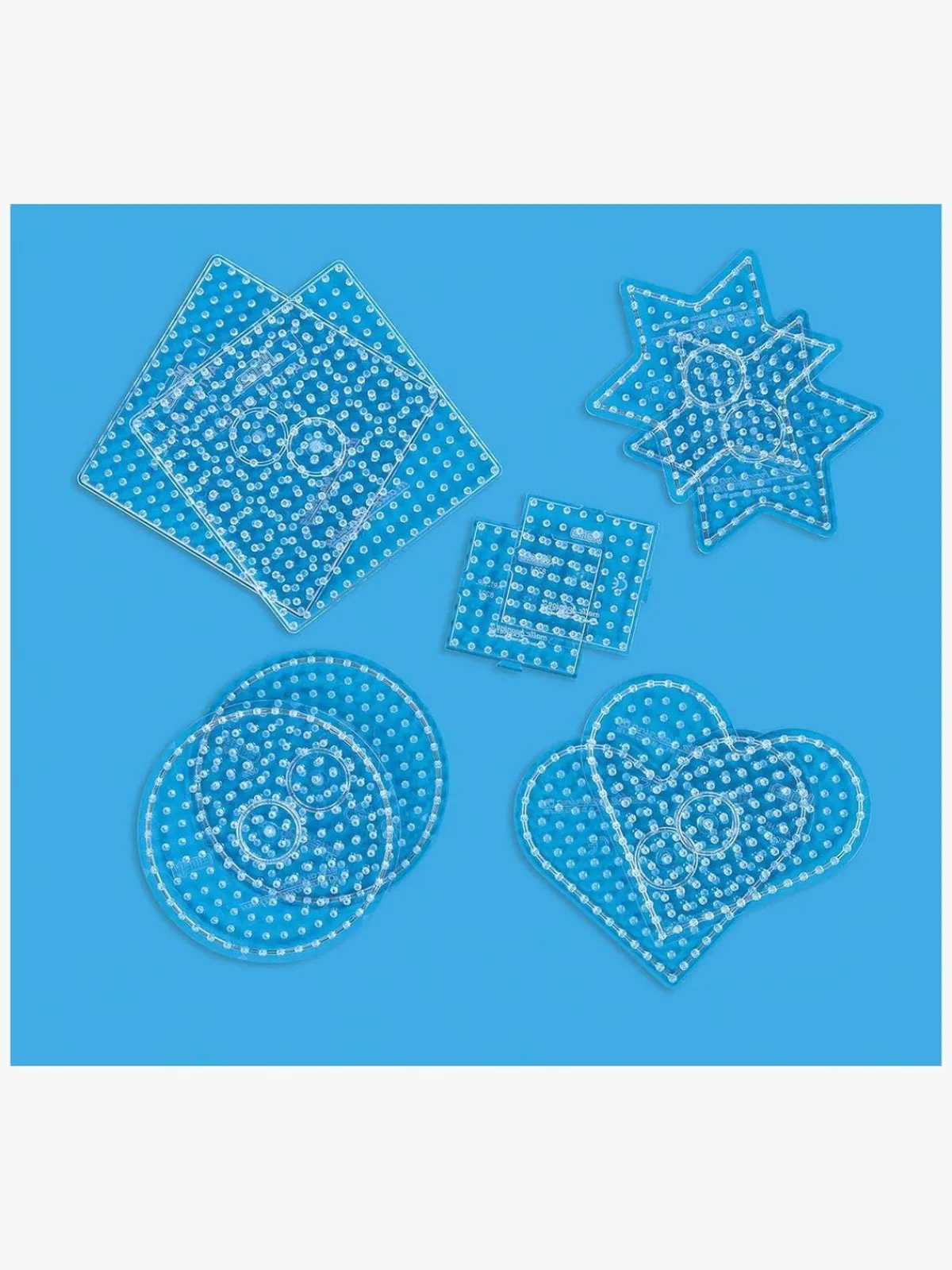 En pakke med 10 perleplader fra Hama. De gennemsigtige perleplader har forskellige geometriske former og vil være fine underlag til kreative perlekreationer. Pakken indeholder runde og firkantede perleplader, formede som hjerter og stjerner.