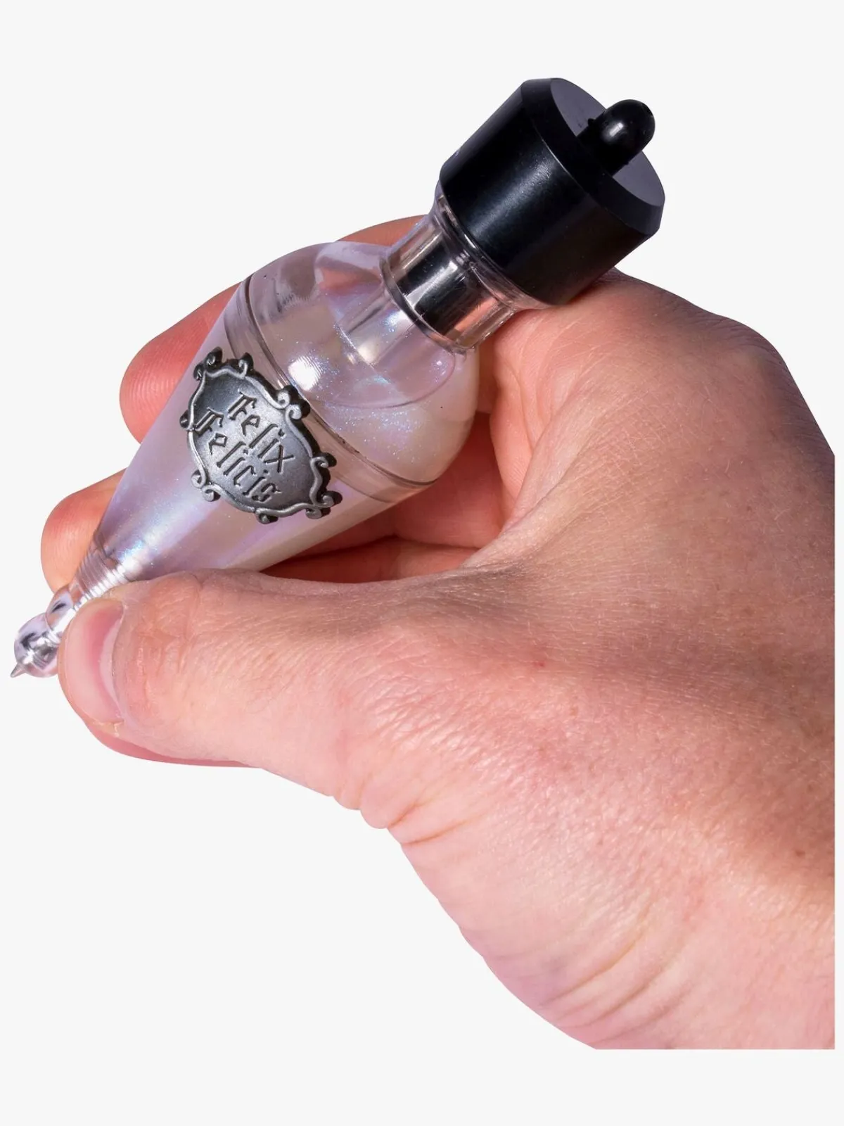 En sej kuglepen med Harry Potter-tema, der forestiller en flaske med hvidt skinnende væske i form af trylledrikken, Felix Felicis. Kuglepennens blæk er sort.
