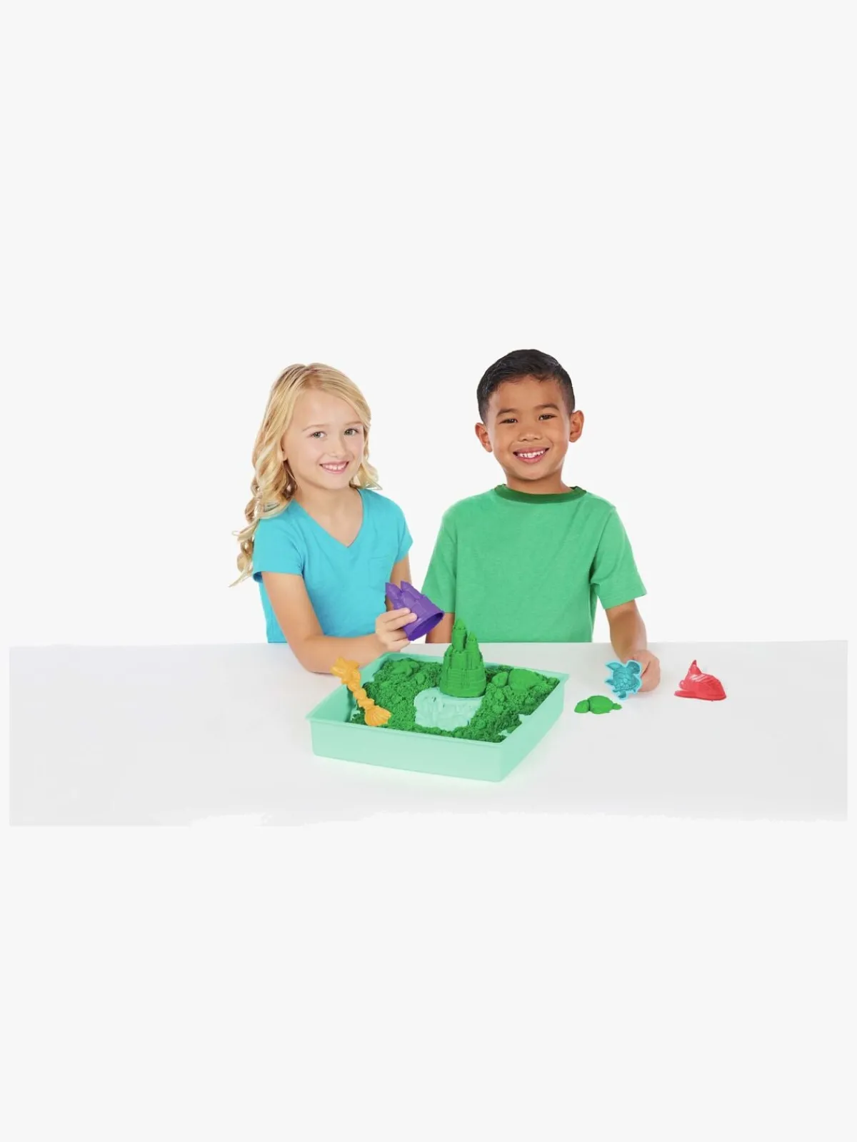 – Indeholder 454 g kinetisk sand, 3 sandfigurer (skildpadde, haj og slot), 1 skovl, 1 sandkasse.