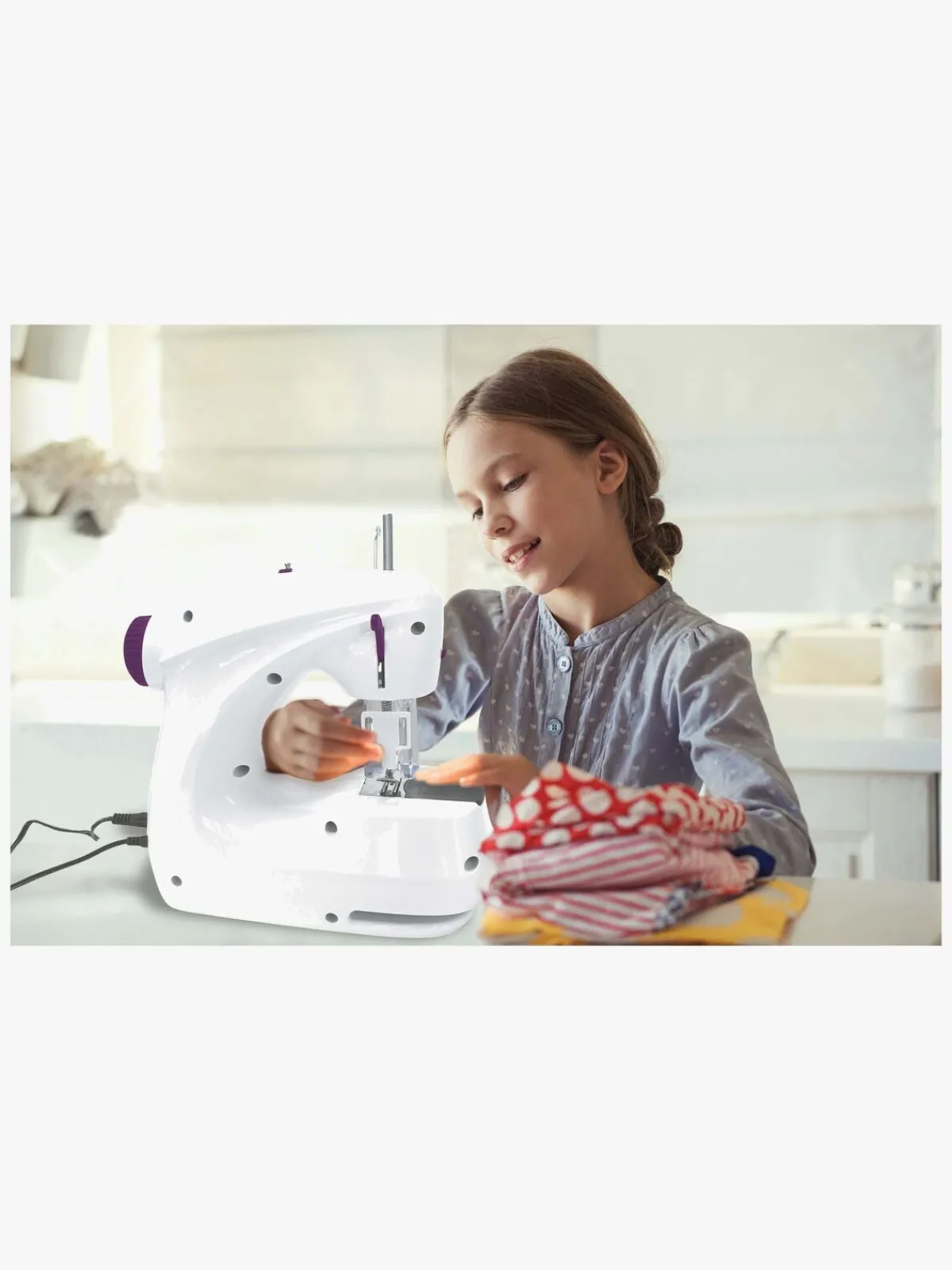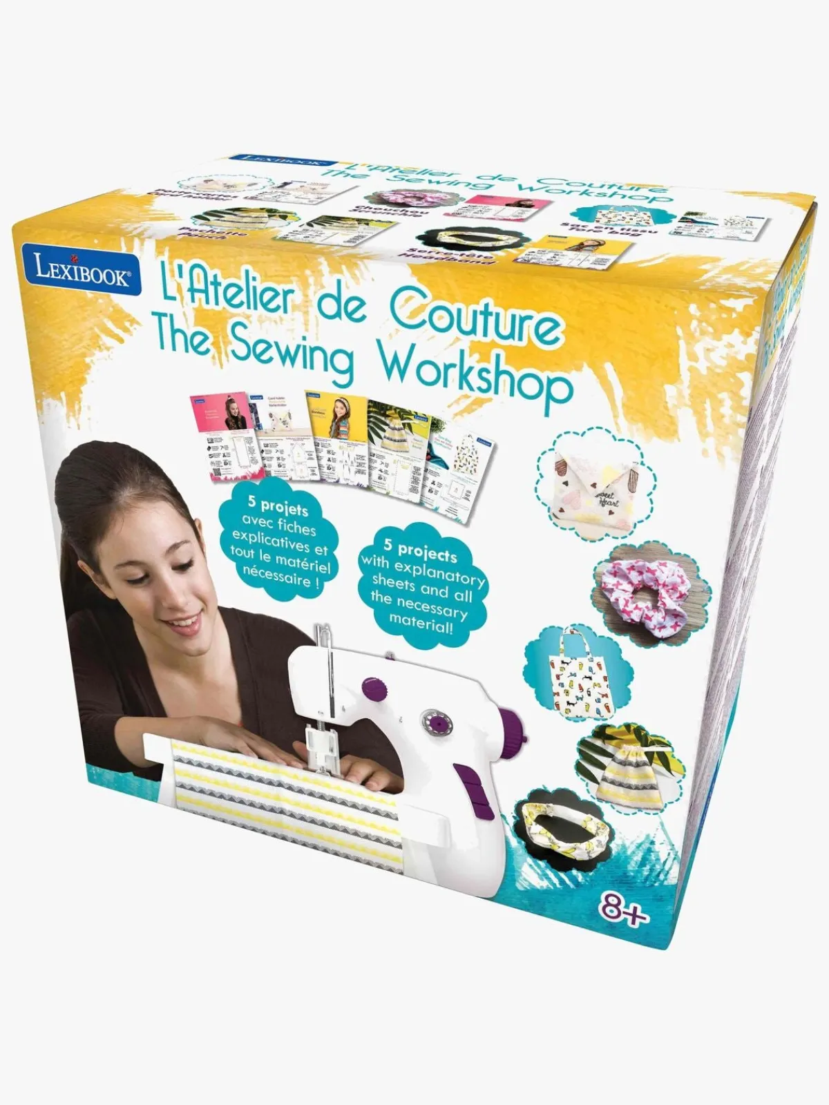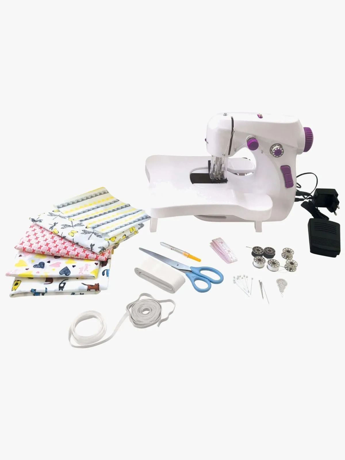 – Inkluderer: bånd, nåle, brugsvejledning, saks, trådruller, stof, målebånd.