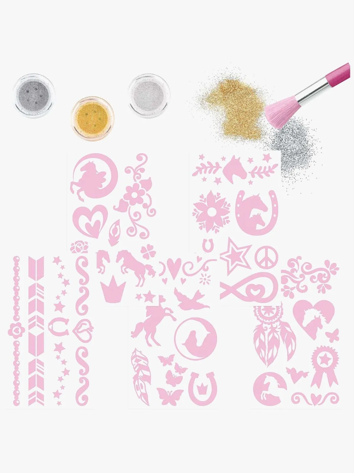 – Indeholder: 38 selvklæbende tatoveringer, 3 glitterfarver, 1 børste, 1 inspirationsbog.