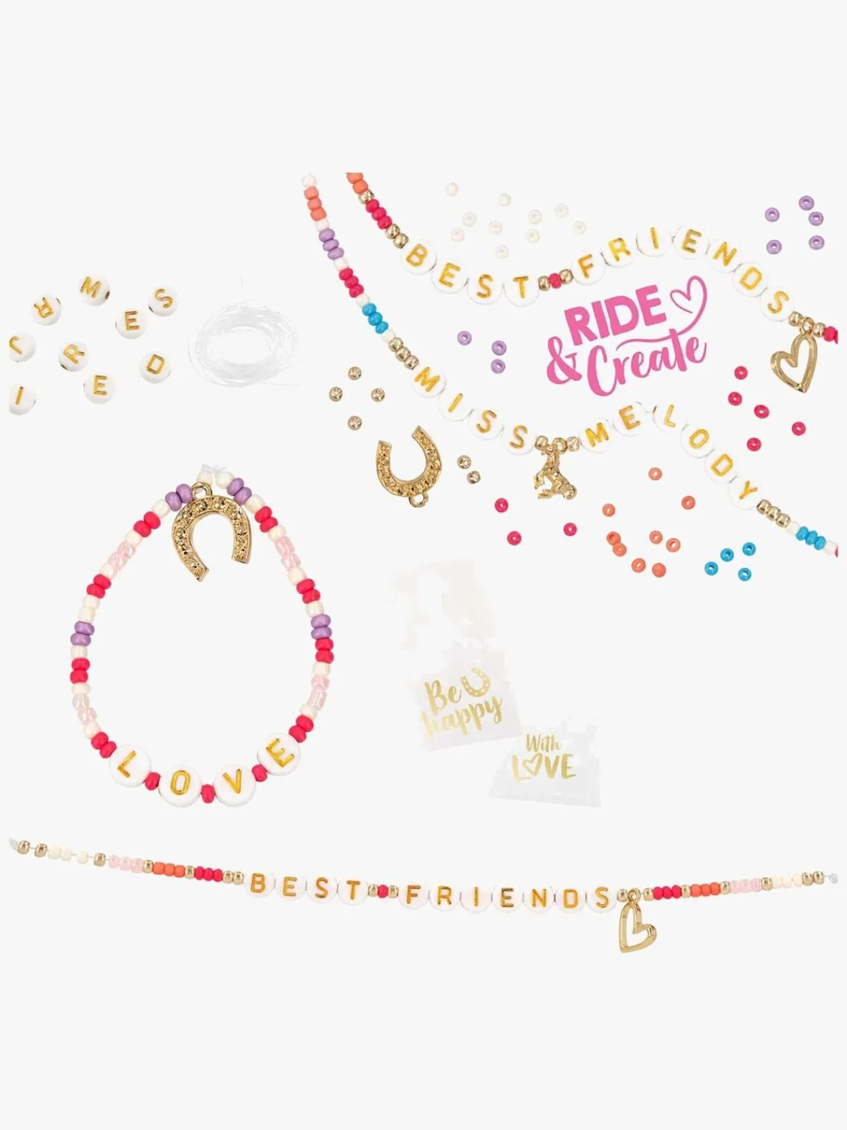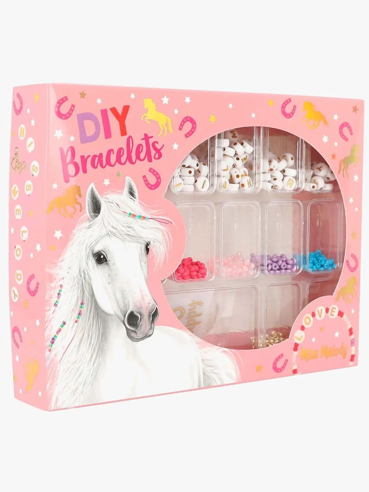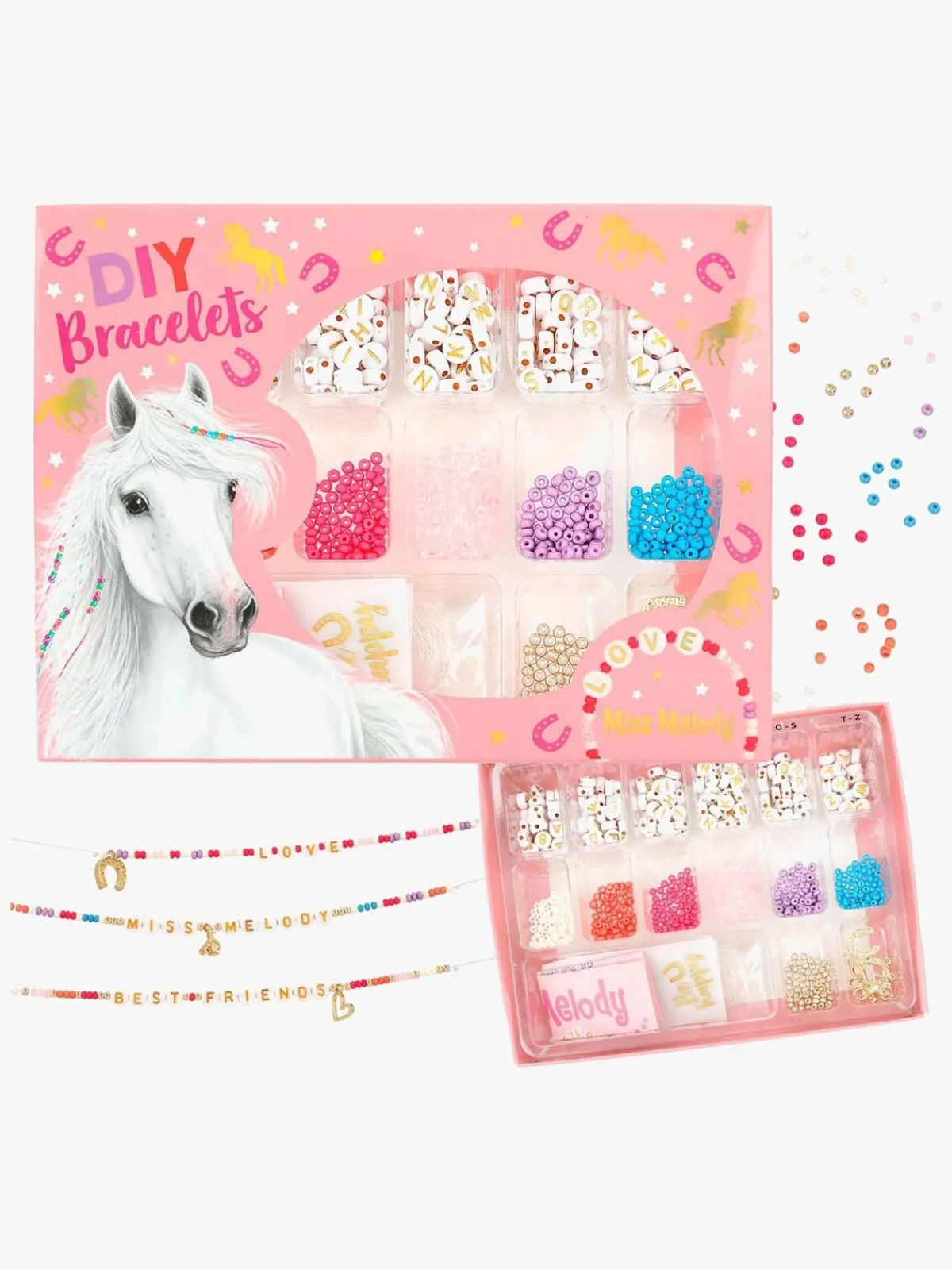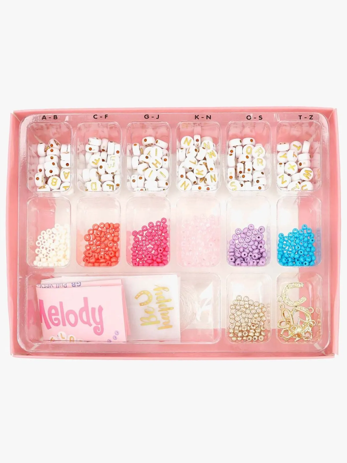 – Indeholder 490 perler, 207 bogstaver, 6 charms og 3 små gaveposer.