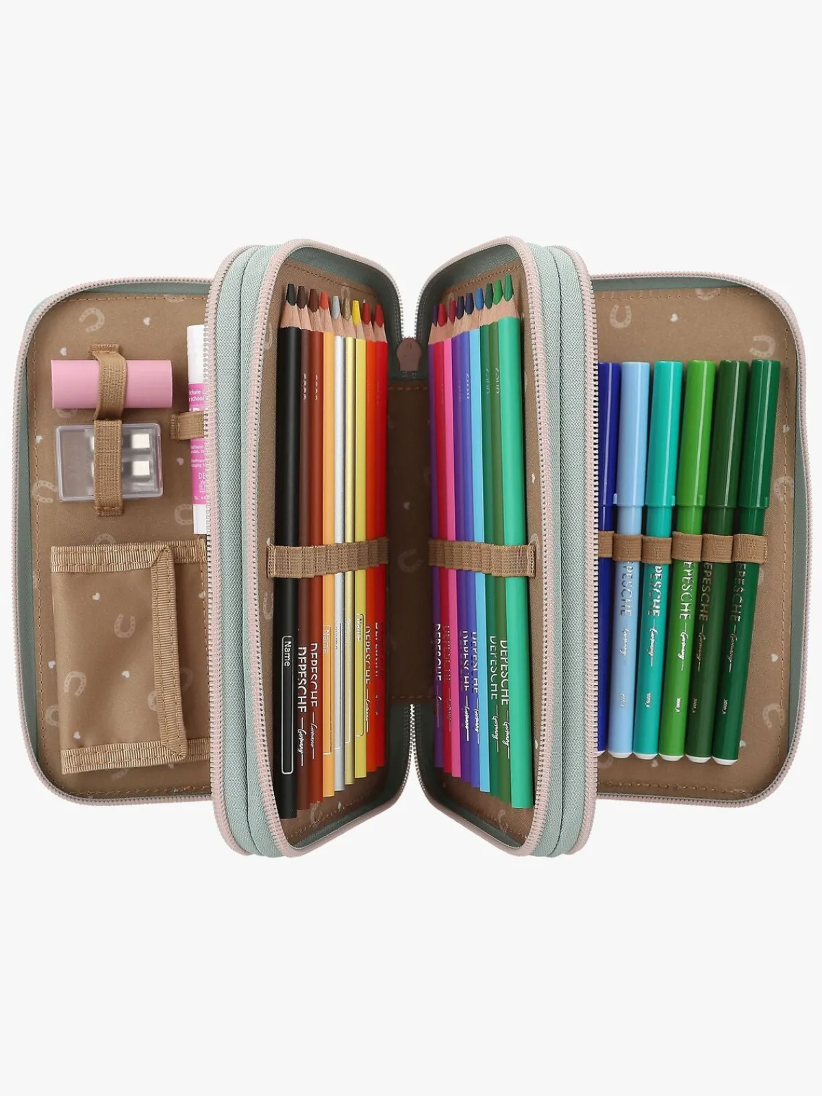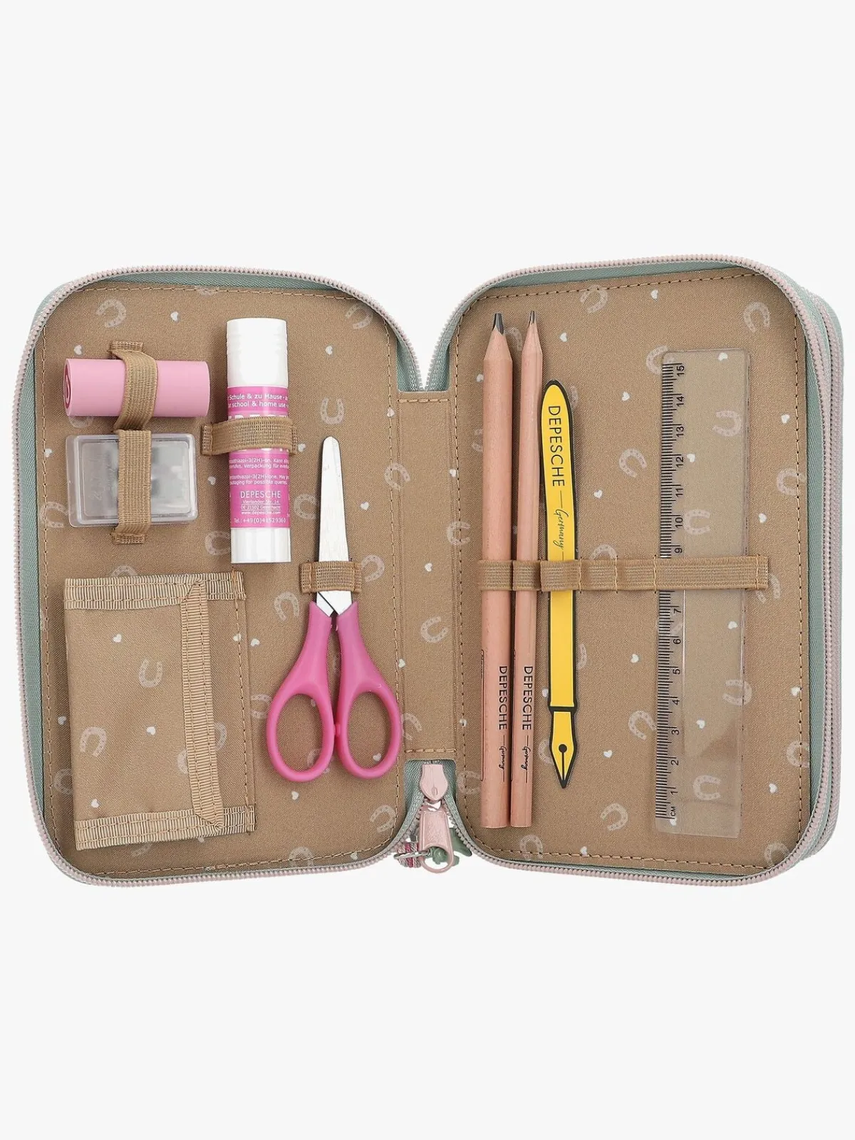 – Indeholder: 1 penalhus, 18 farveblyanter, 18 tusser, 2 blyanter, 1 saks, 1 limstift, 1 blyantspidser, 1 lineal, 1 viskelæder.