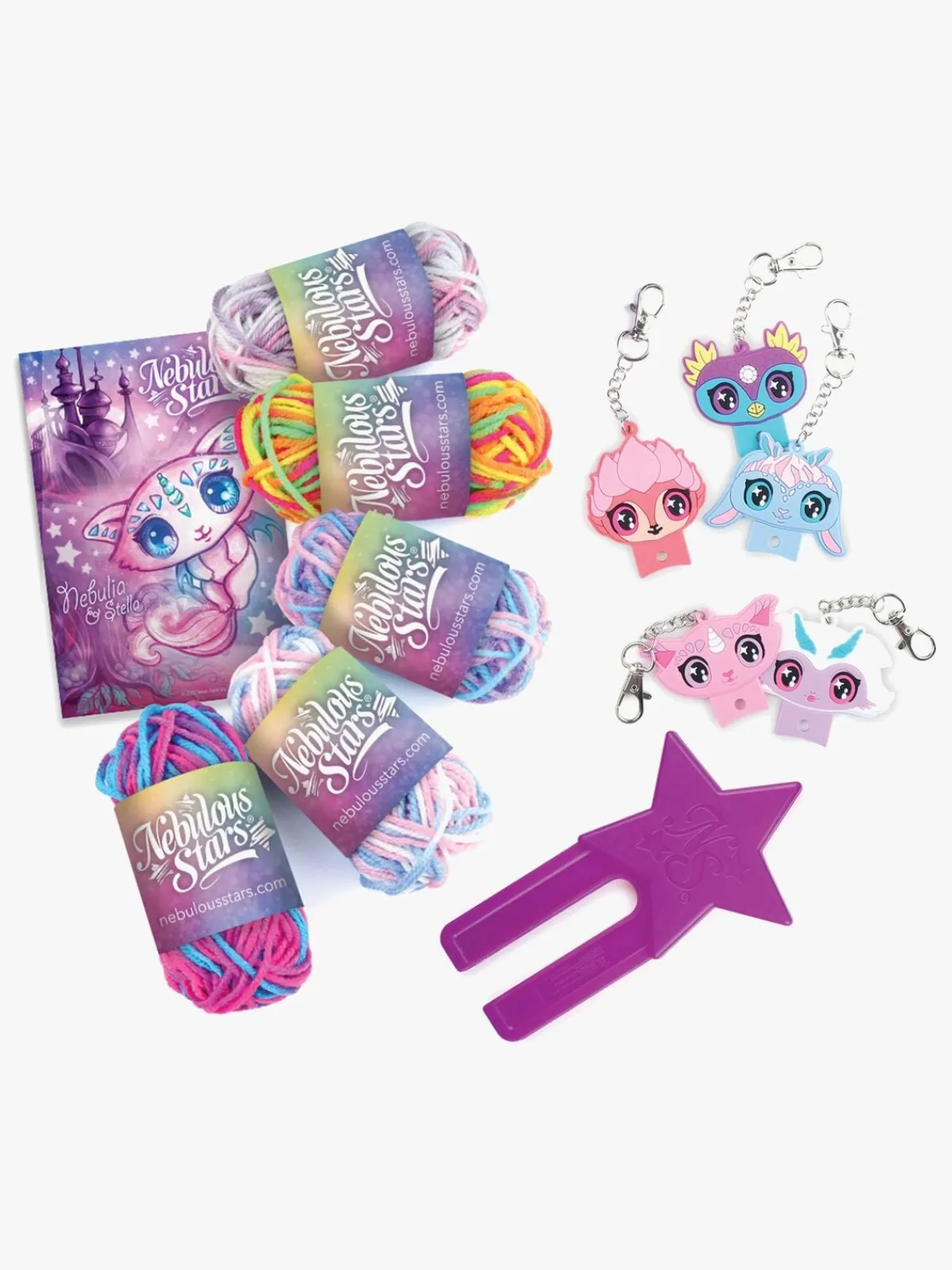 – Indeholder: 5 nøgleringe, 5 garner, 1 værktøj, 1 instruktionsbog.