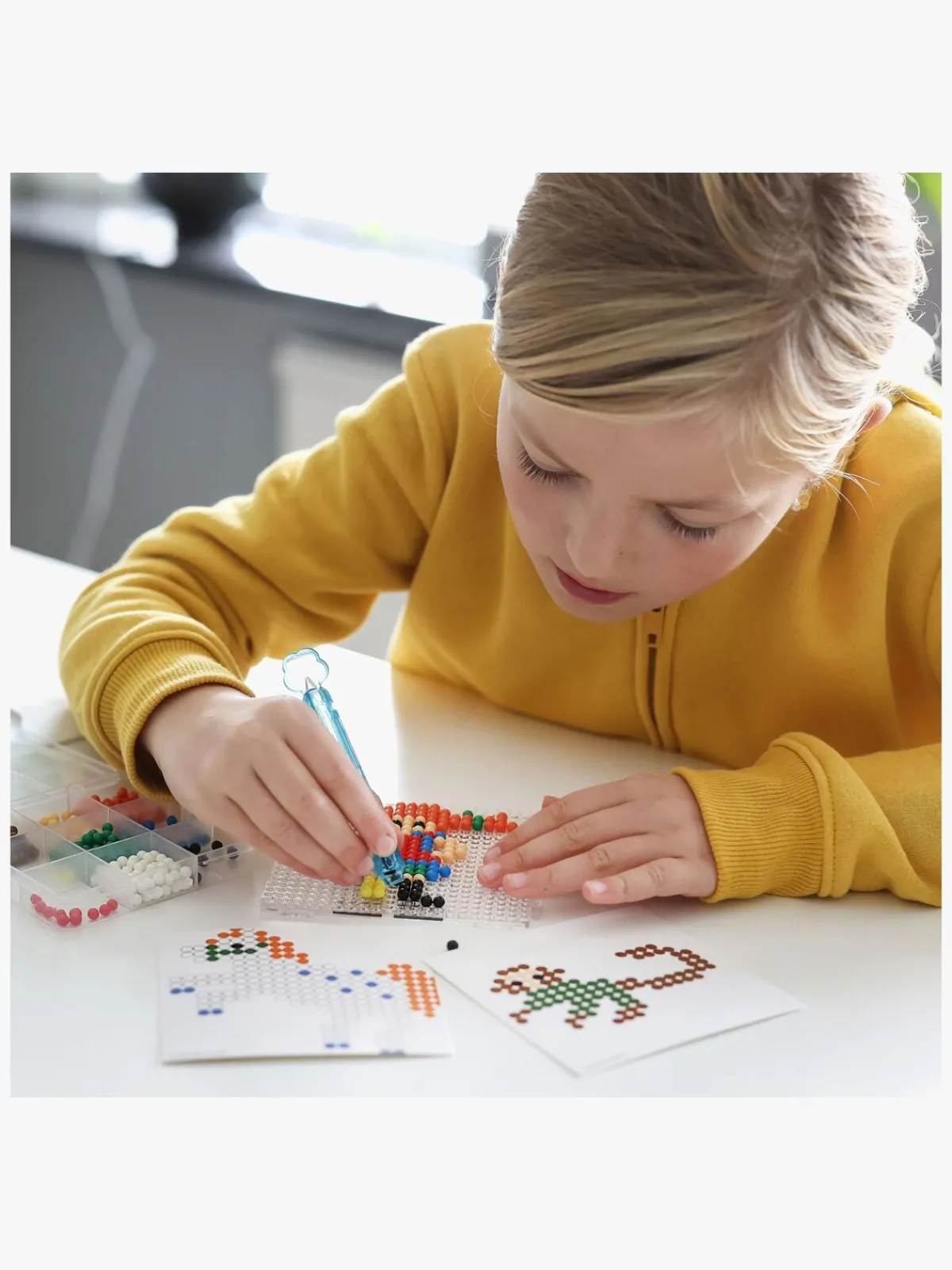 – Placer perlerne på pladen, spray med vand, vent, og så er kunstværket færdigt.