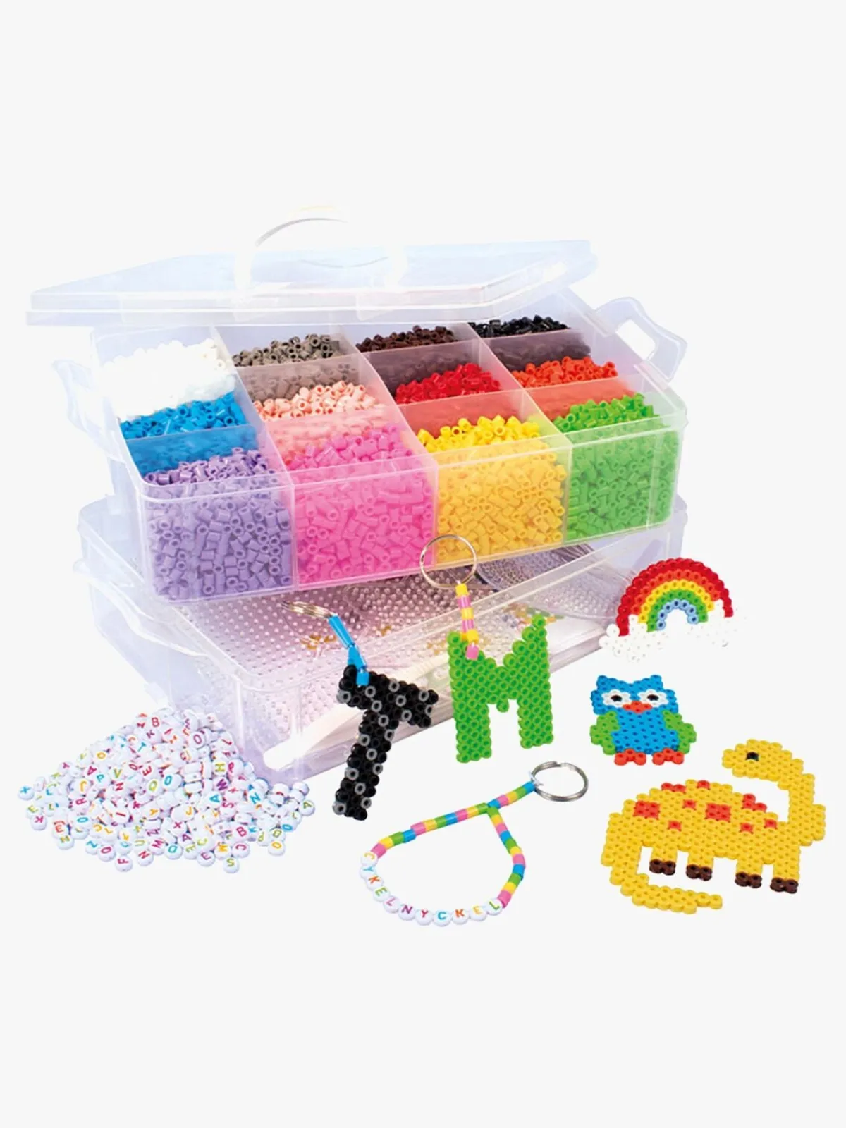 – Indeholder: 12000 perler, 3 perleplader, 5 nøgleringe, 1 pincet, 1 5 meter lang elastisk snor.