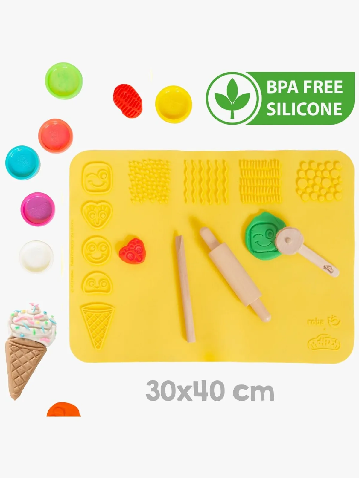 – Indeholder: 1 forklæde, 1 Skolebord med opbevaring, 1 kreamåtte, 1 stol, 1 kagerulle, 1 pizzaskærer, 1 modelleringsværktøj, 6 bøtter med Play-Doh.