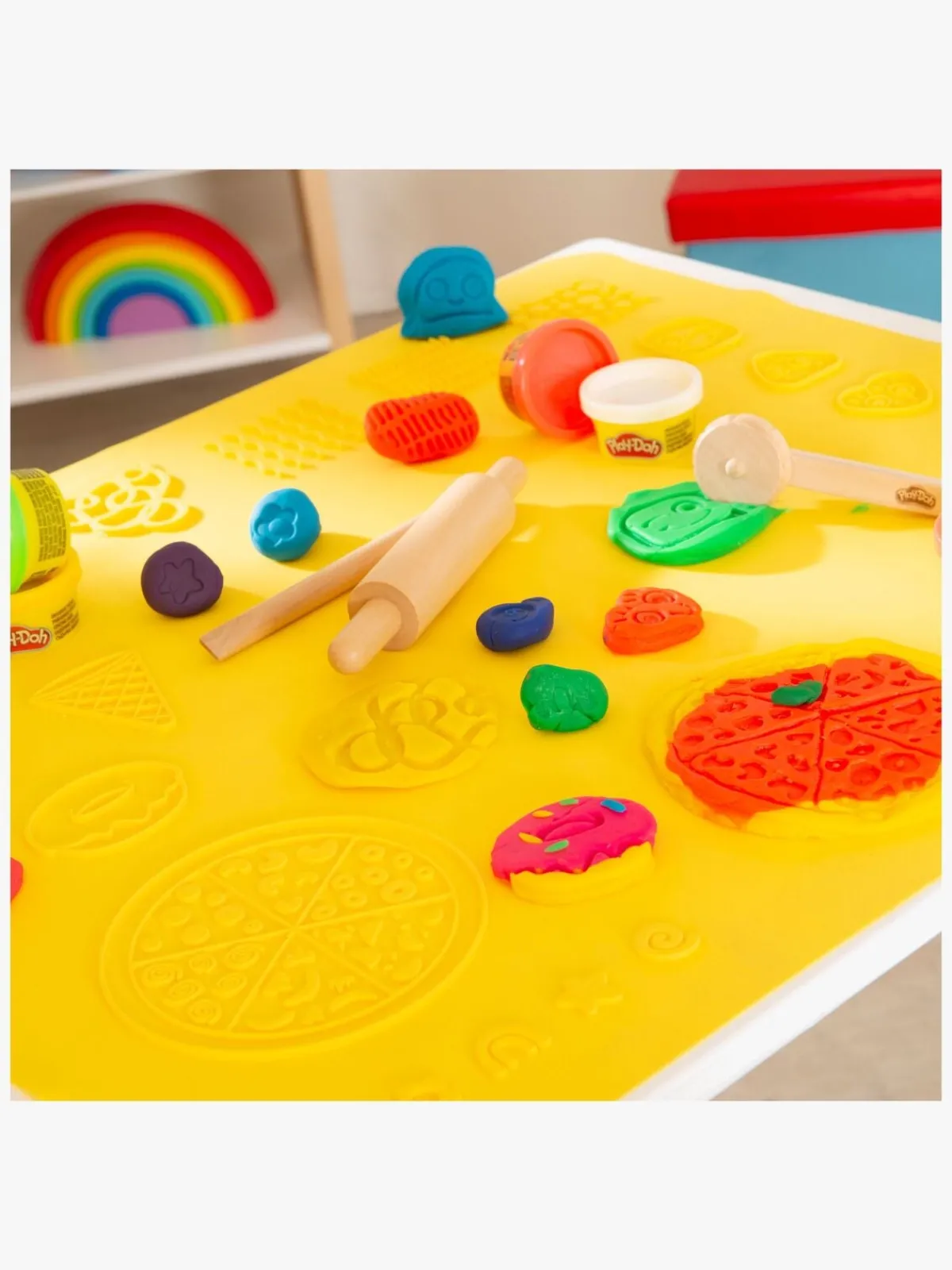 – Indeholder: 1 kreamåtte, 1 kagerulle, 1 pizzaskærer, 1 modelleringsværktøj, 12 bøtter med Play-Doh.