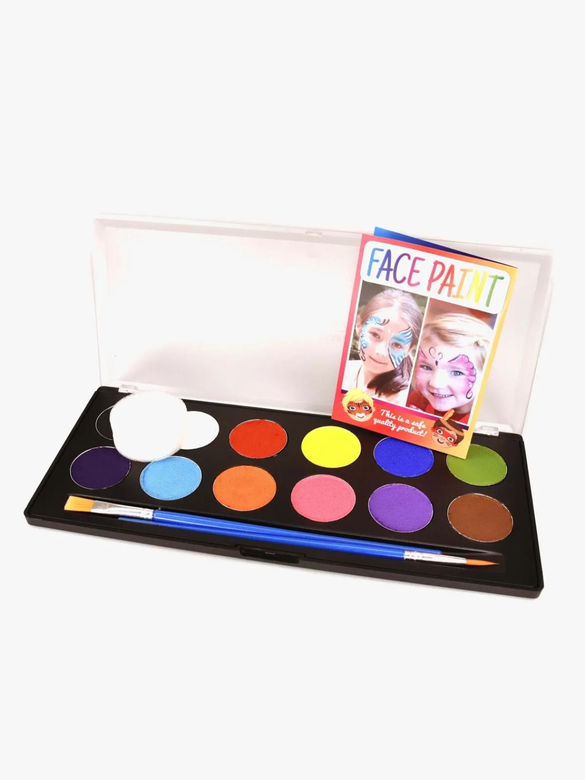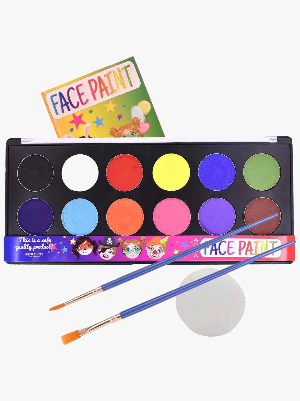 Lav flotte ansigtsmalerier med denne palette fra Robetoys. Paletten består af 12 fine farver, en svamp og pensler i to størrelser. Hvad bliver dit næste kunstværk — en tiger, en pirat, en klovn eller en sommerfugl?