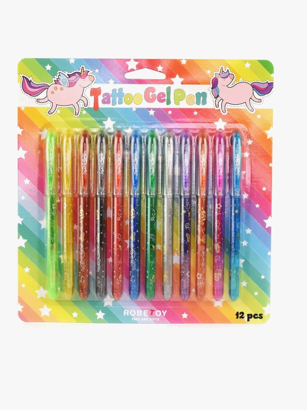 En pakke med 12 glitterpenne fra Robetoy. Lav dine egne personlige og farverige tatoveringer med disse glittertatoveringspenne i 12 forskellige farver. Brug din fantasi og tegn direkte på huden. Tatoveringerne er lette at vaske af med sæbe og vand.