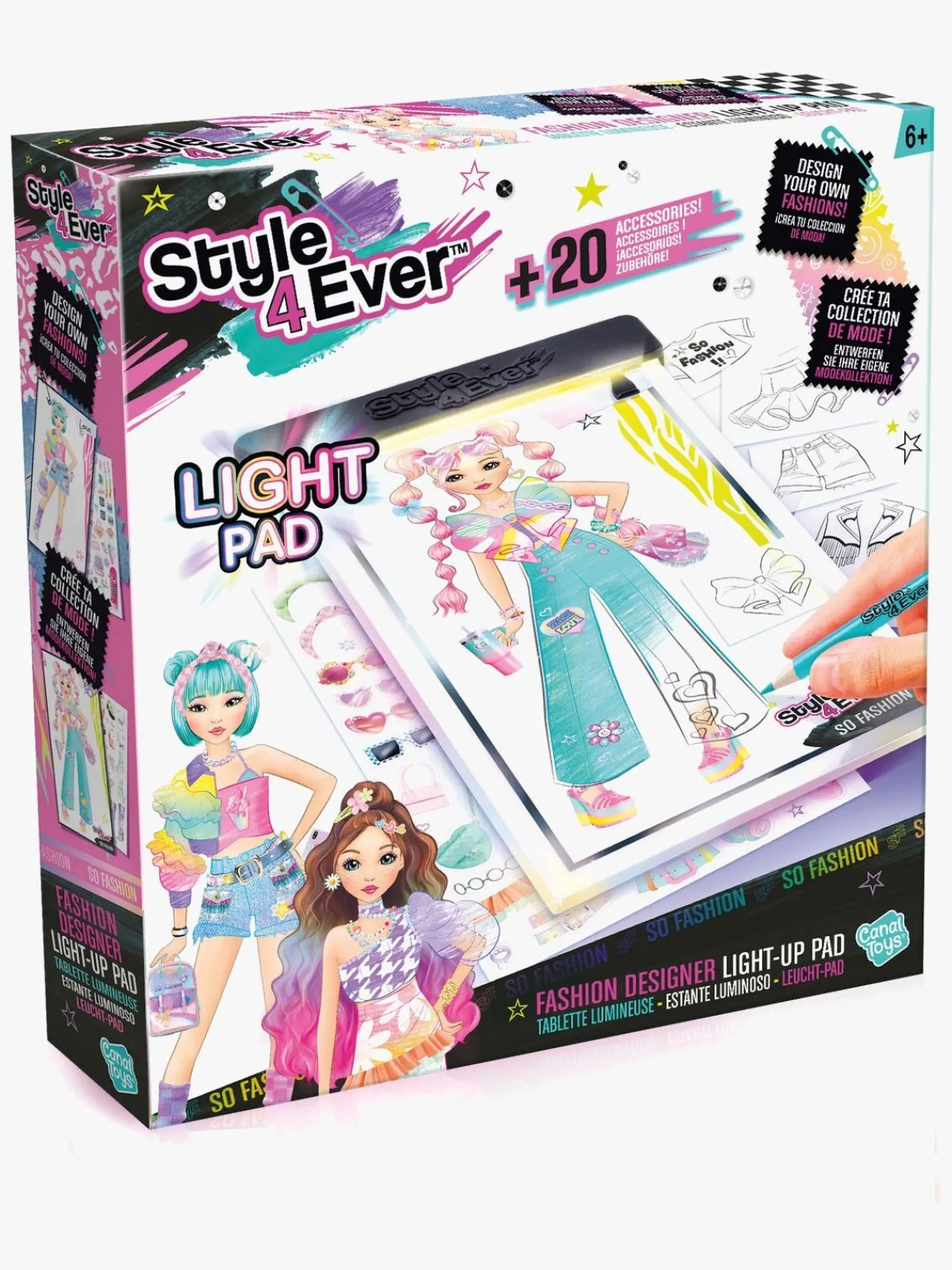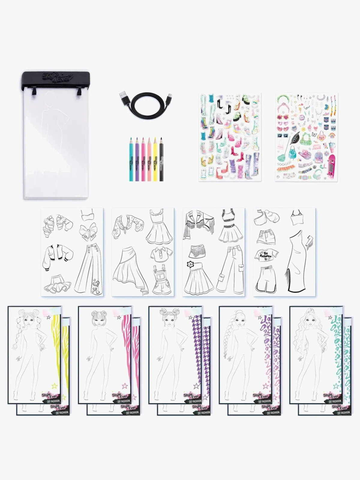 – Indeholder: 1 Light-up Pad, 6 ark med klistermærker, 6 farveblyanter, 10 stenciler, 1 oplader.