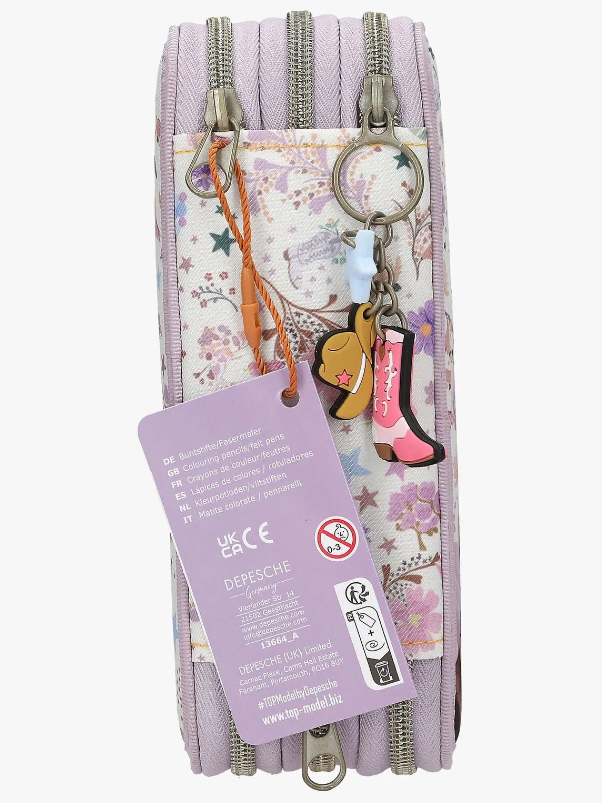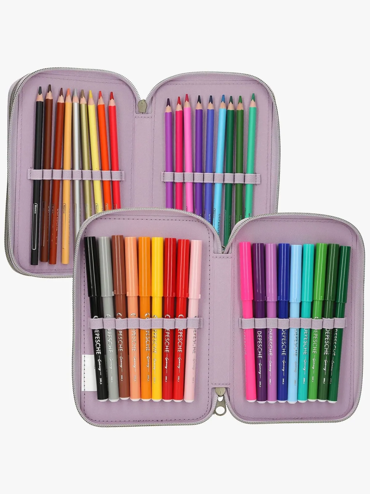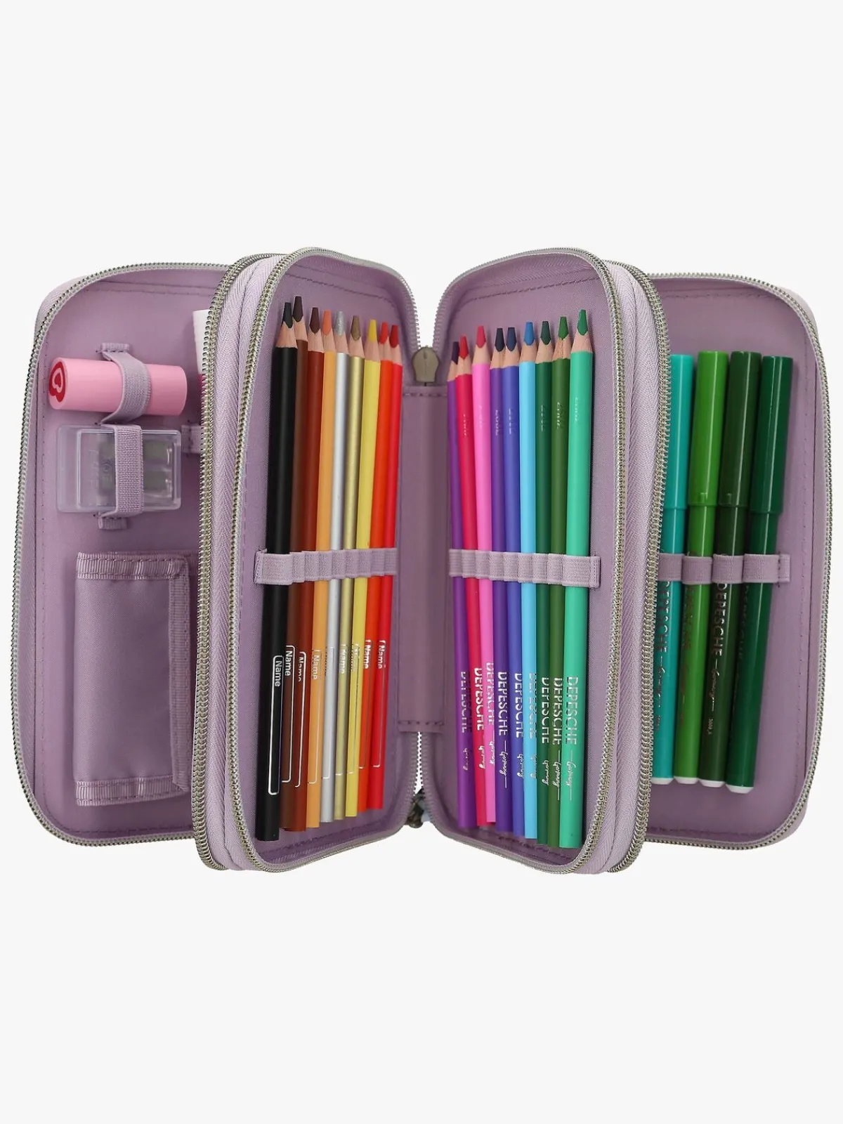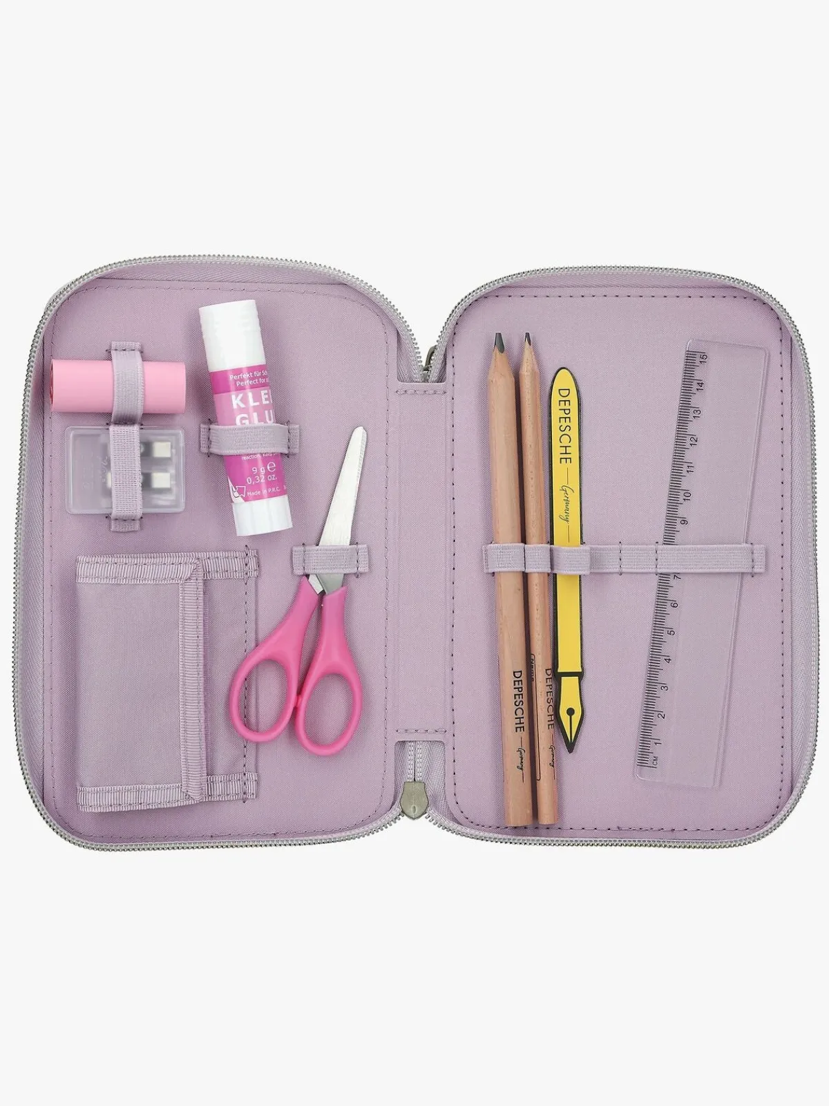 – Indeholder: 1 penalhus, 18 farveblyanter, 18 tusser, 2 blyanter, 1 saks, 1 limstift, 1 blyantspidser, 1 lineal, 1 viskelæder.