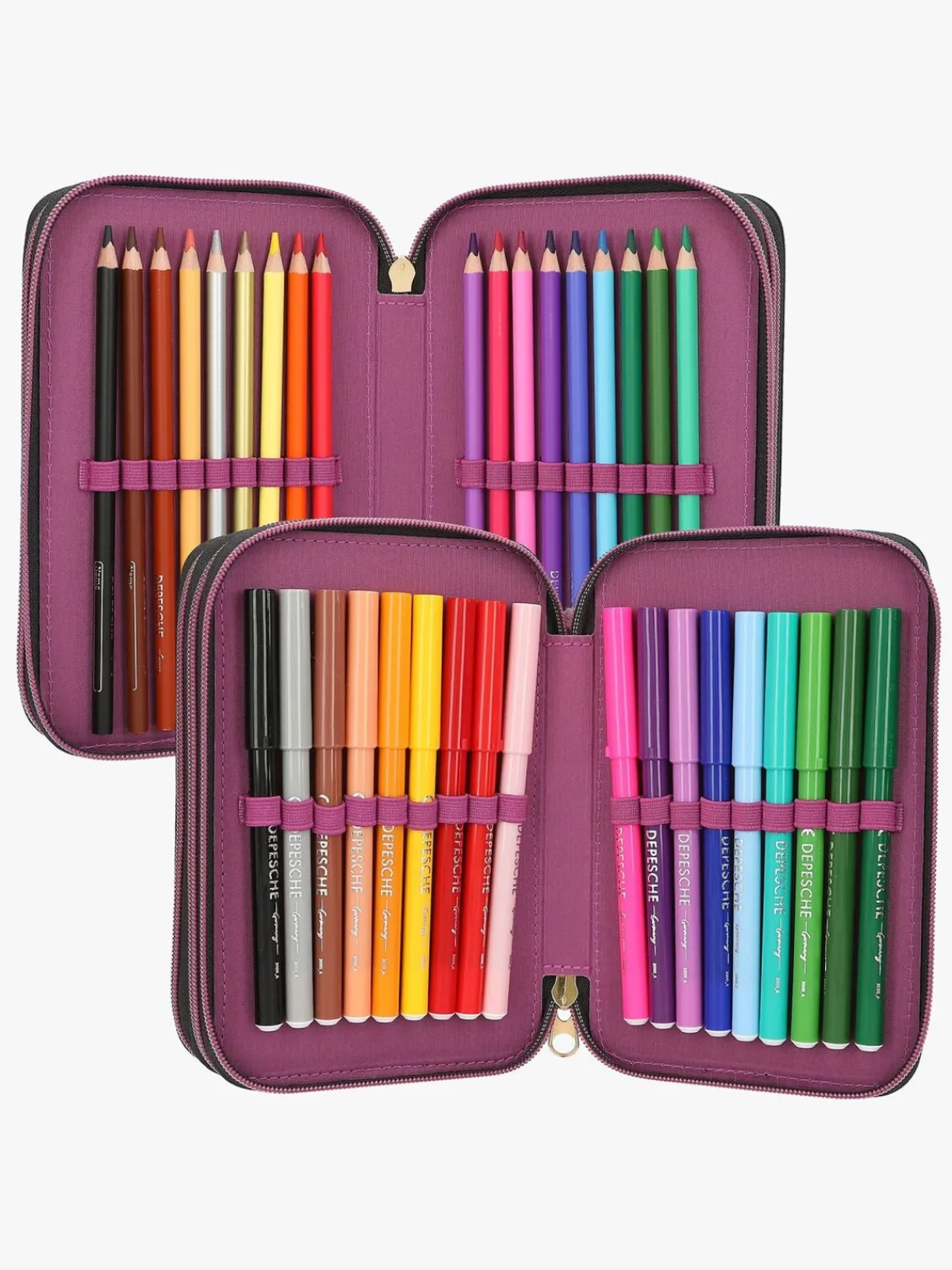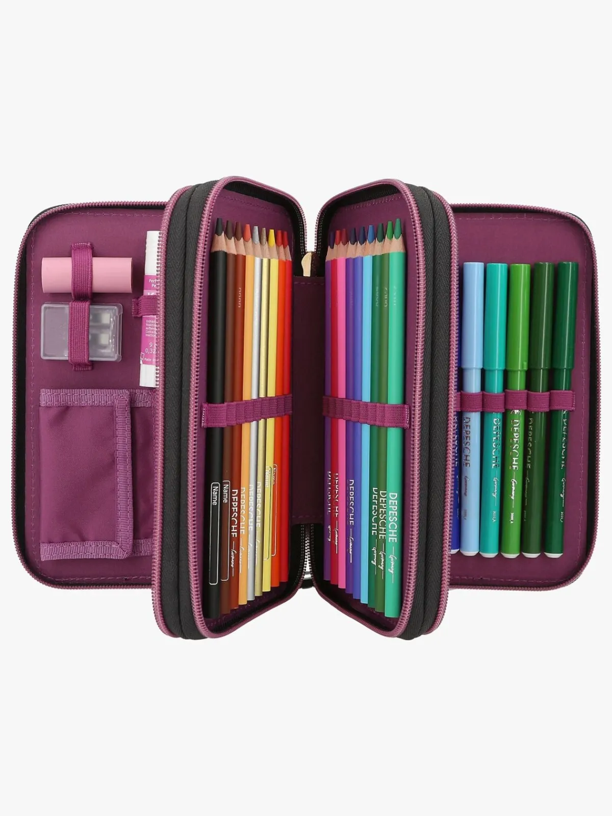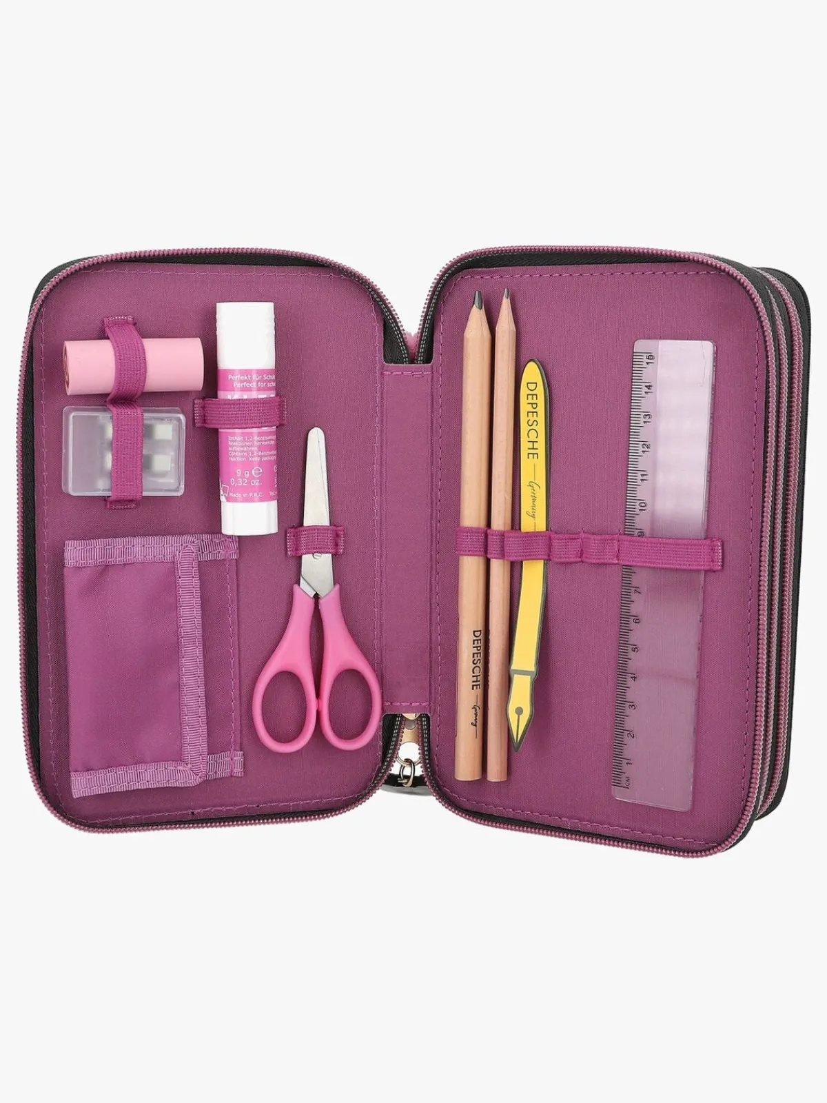 – Indeholder: 1 penalhus, 18 farveblyanter, 18 tusser, 2 blyanter, 1 saks, 1 limstift, 1 blyantspidser, 1 lineal, 1 viskelæder.