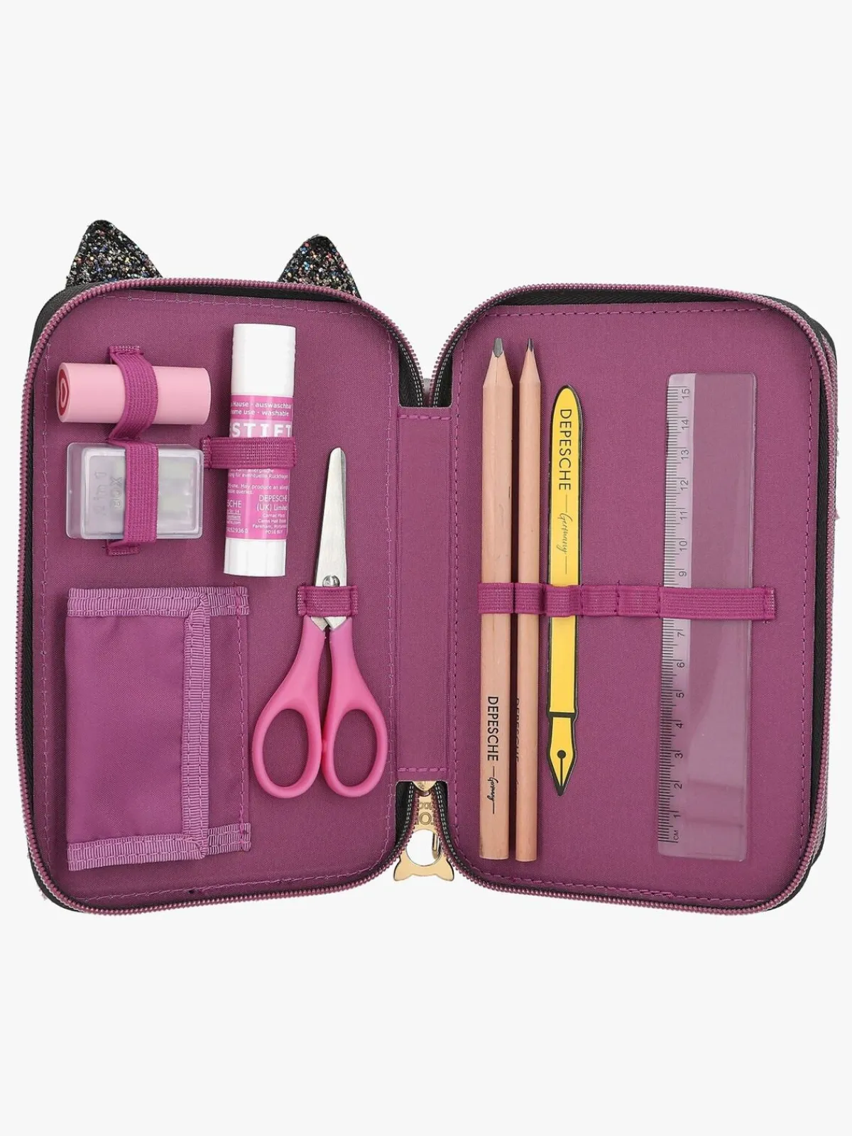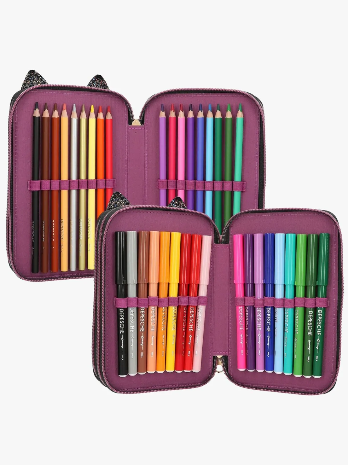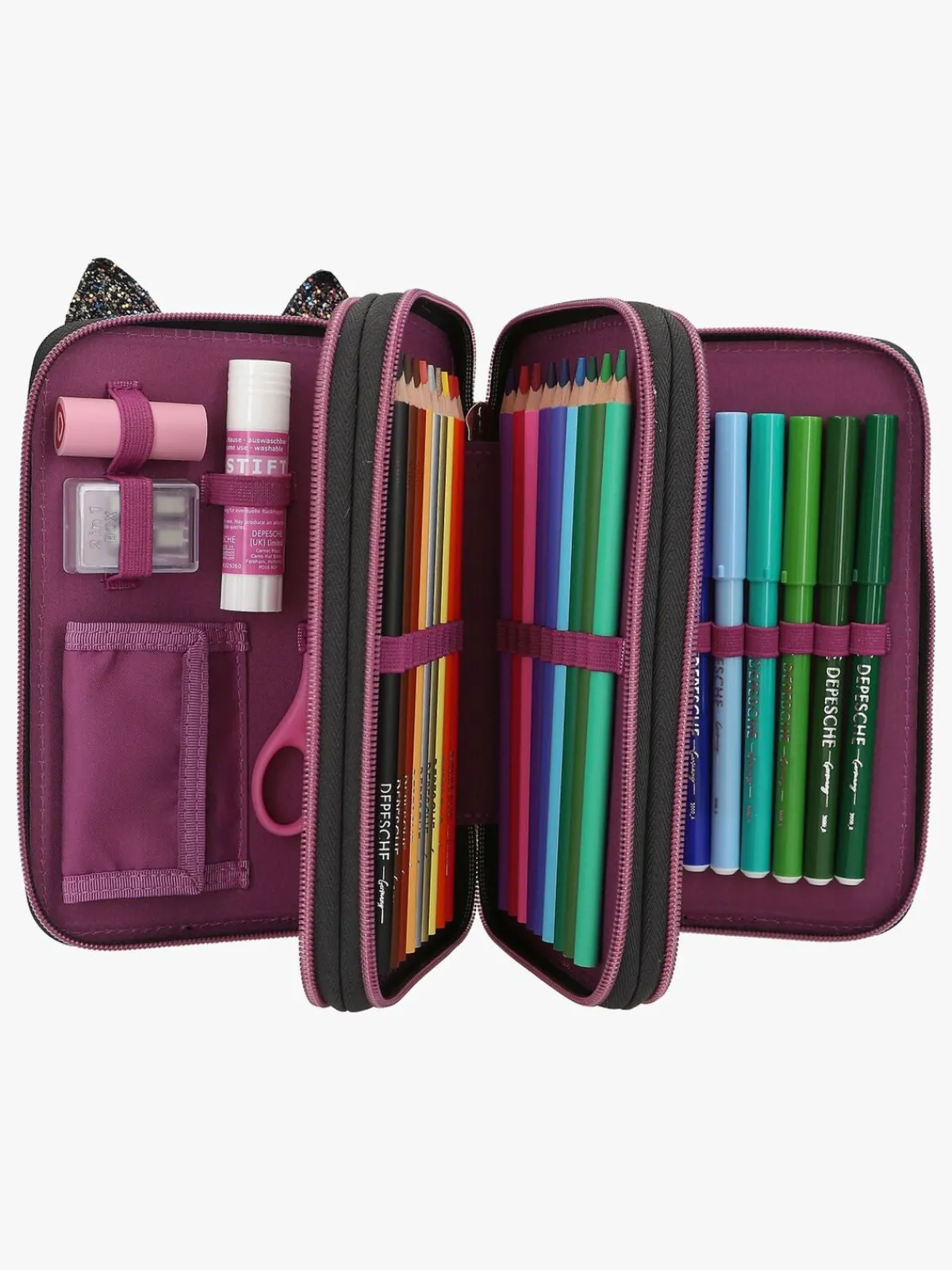 – Indeholder: 1 penalhus, 18 farveblyanter, 18 tusser, 2 blyanter, 1 saks, 1 limstift, 1 blyantspidser, 1 lineal, 1 viskelæder.