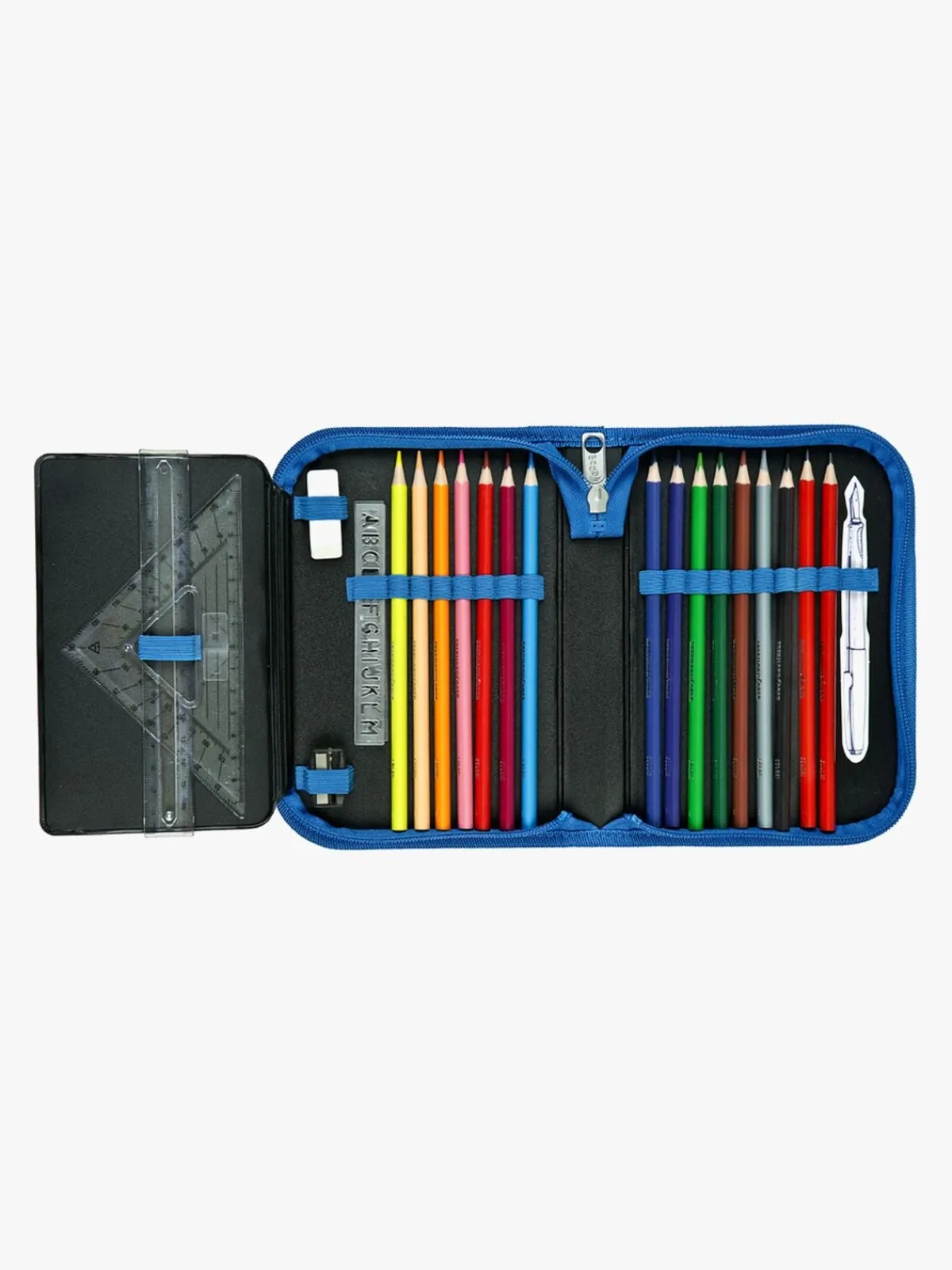 – Indeholder: 1 penalhus, 14 farveblyanter, 2 blyanter, 1 viskelæder, 2 linealer, 2 skabeloner.