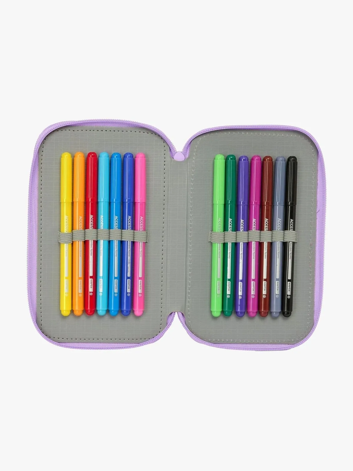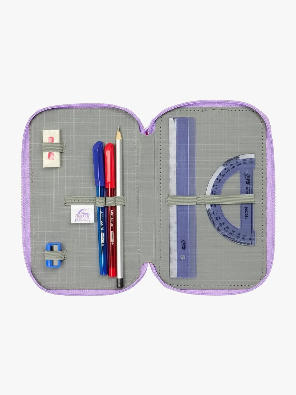 – Indeholder: 1 penalhus, 1 viskelæder, 1 blyant, 2 kuglepenne, 1 blyantspidser, 2 linealer, 16 farveblyanter, 14 tusser.