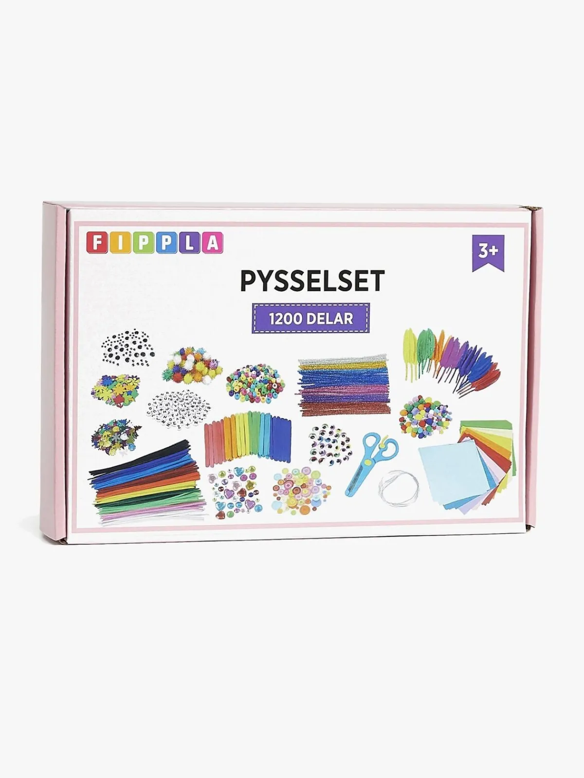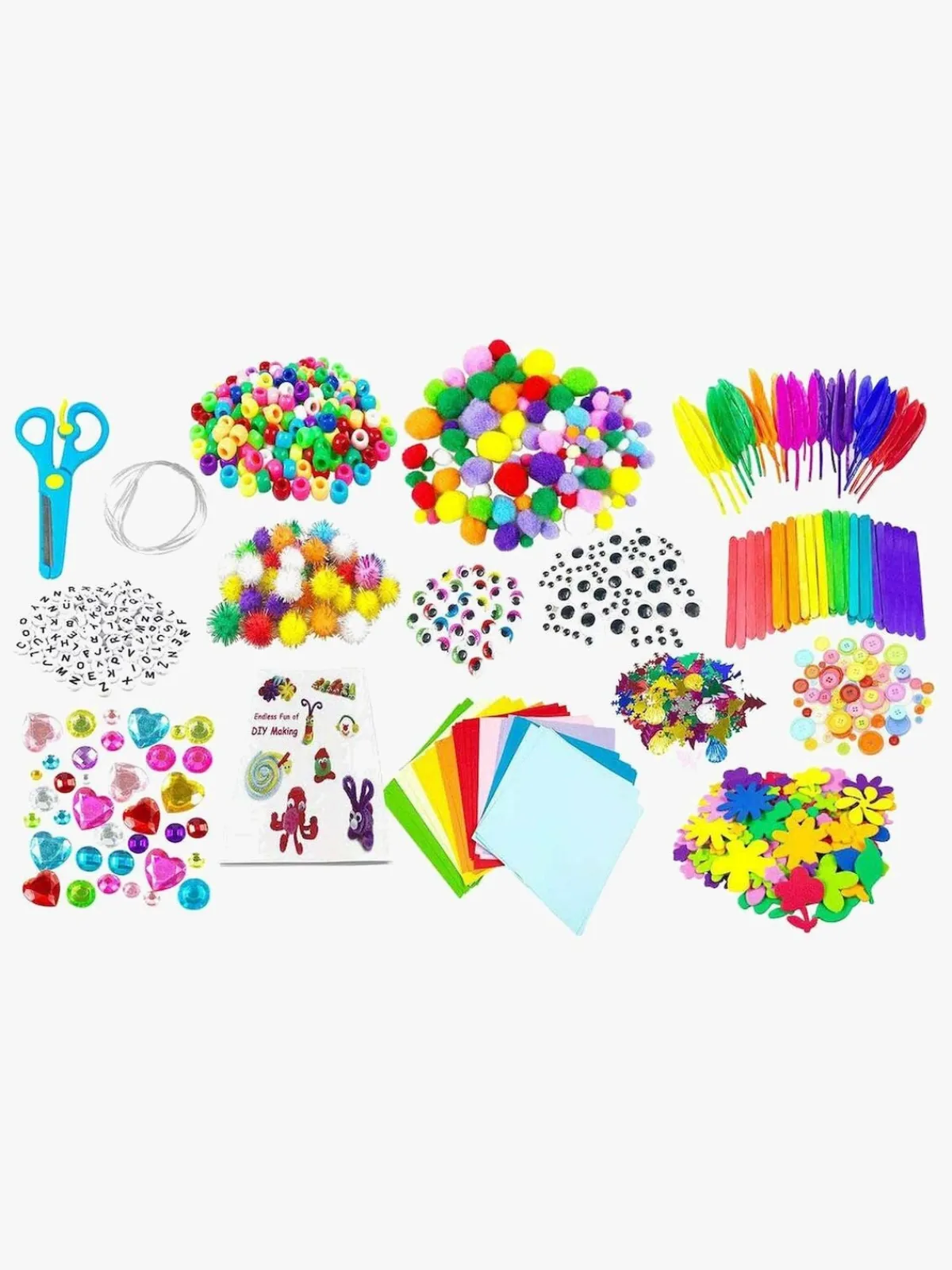 – Indeholder: perler, knapper, ædelsten, bogstaver, farvede papirark, forskellige stofdekorationer, en saks, en snor, en inspirationsbog og en masse andet tilbehør.