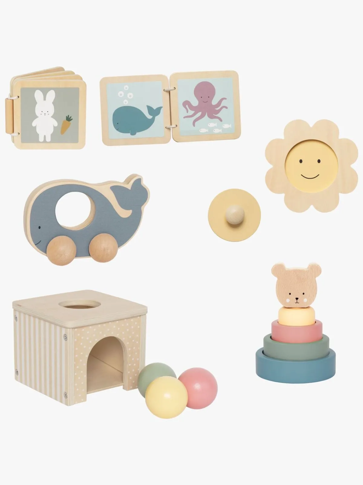 – Indeholder: 1 træklegetøj, 1 bog, 1 puslespil, 1 aktivitetskasse med kugler, 1 stablelegetøj.