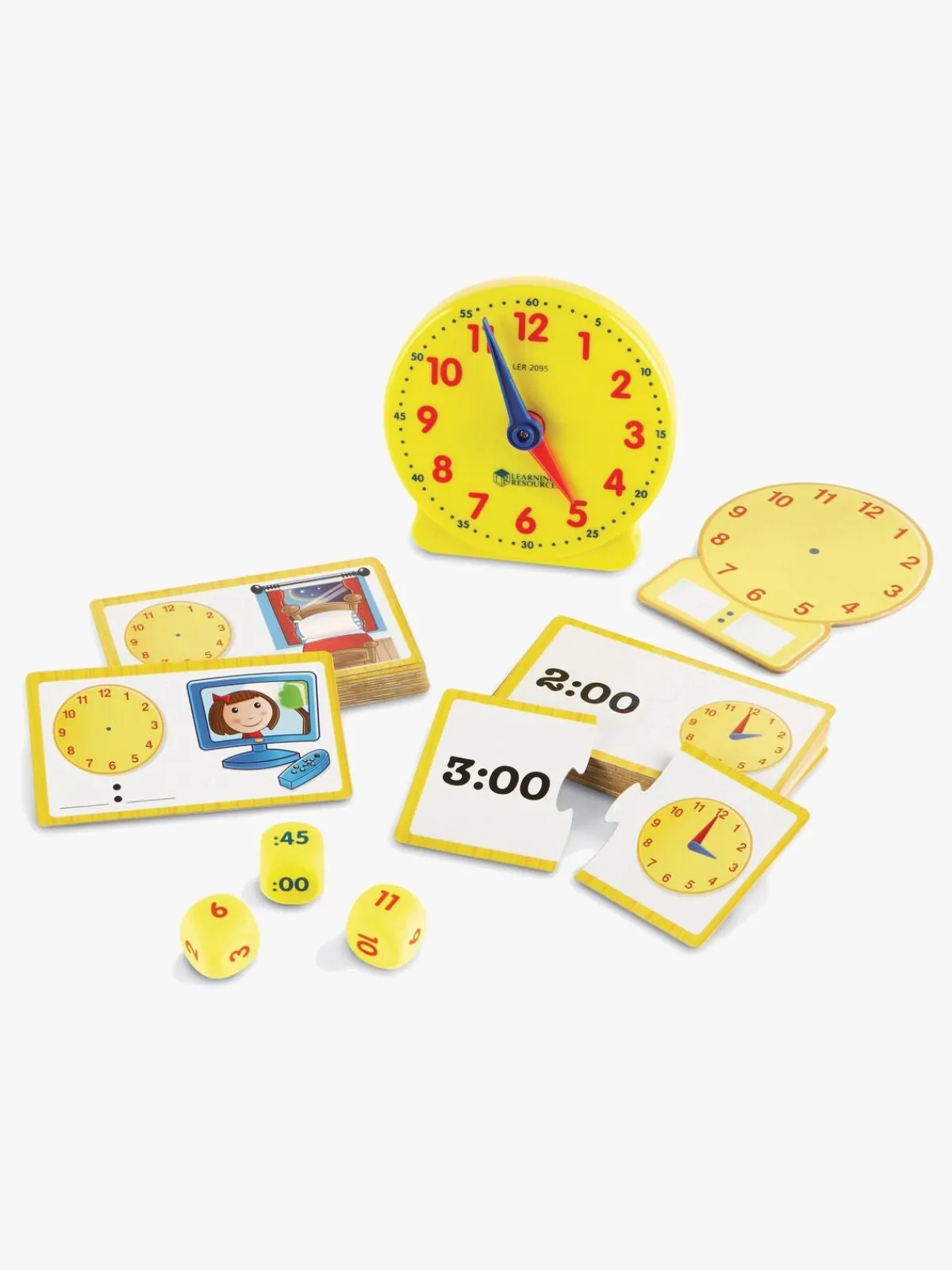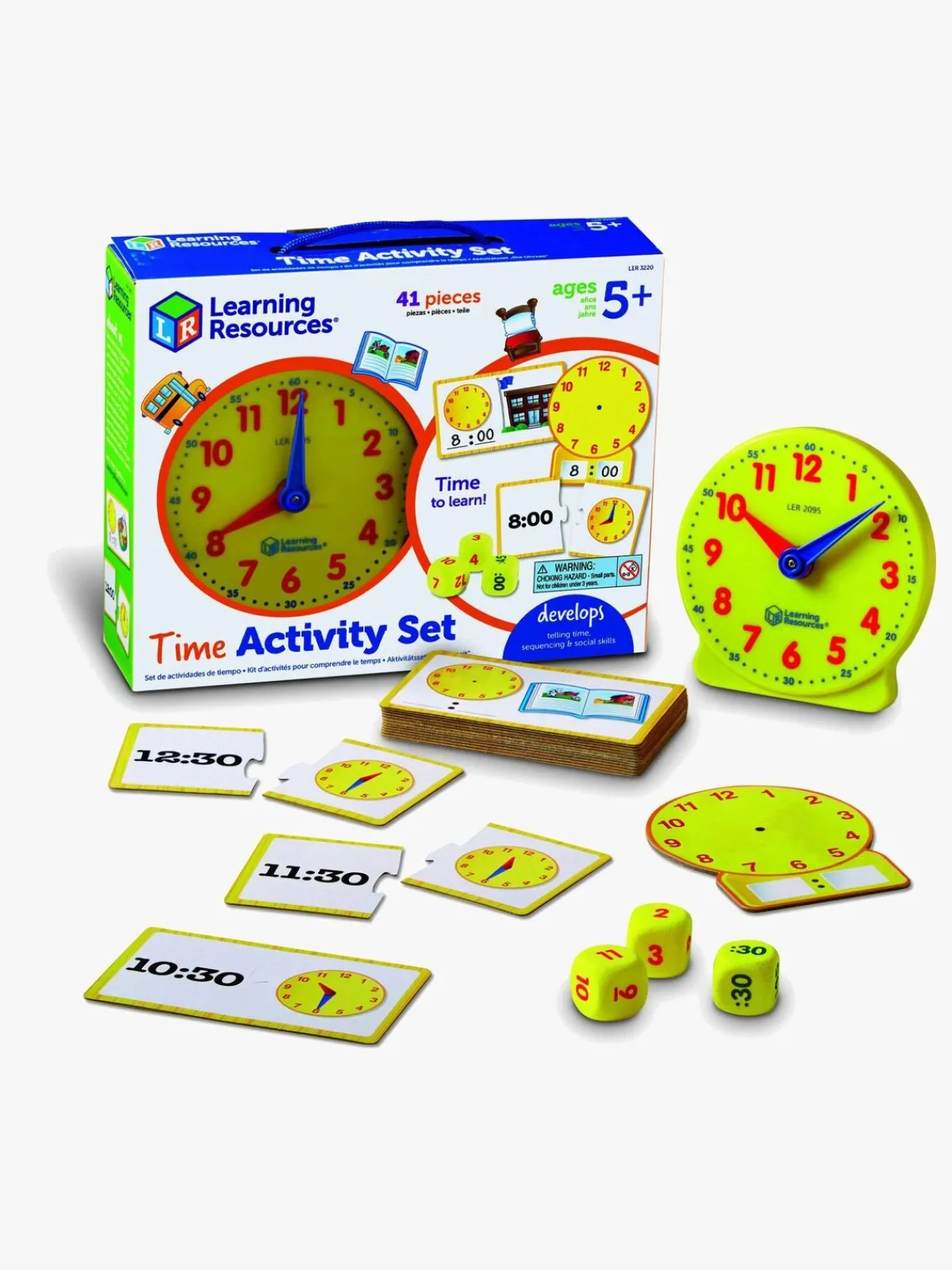 – Indeholder: 3 terninger, 24 dobbeltsidede kort med forskellige tider, 12 aktivitetskort, 1 ur.