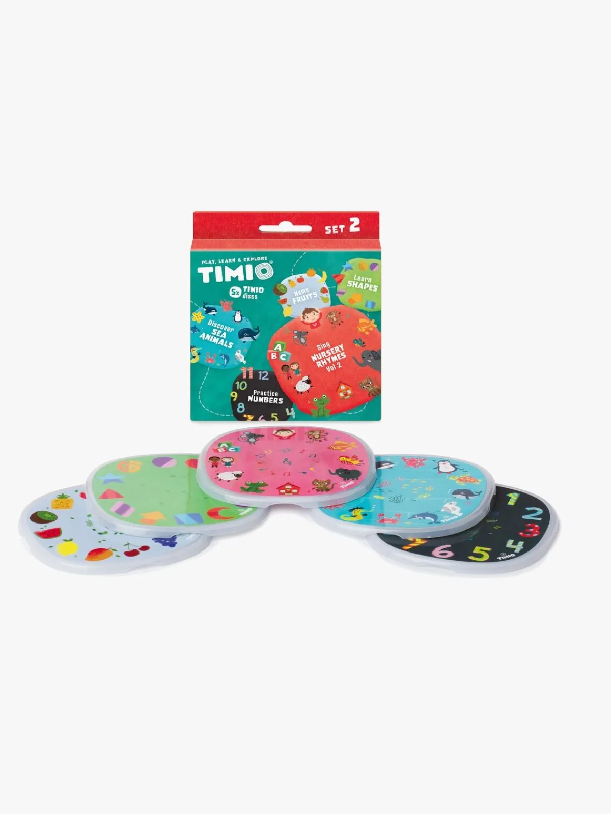 – Indeholder: 5 skiver med sange, tal, dyr, former og frugter.